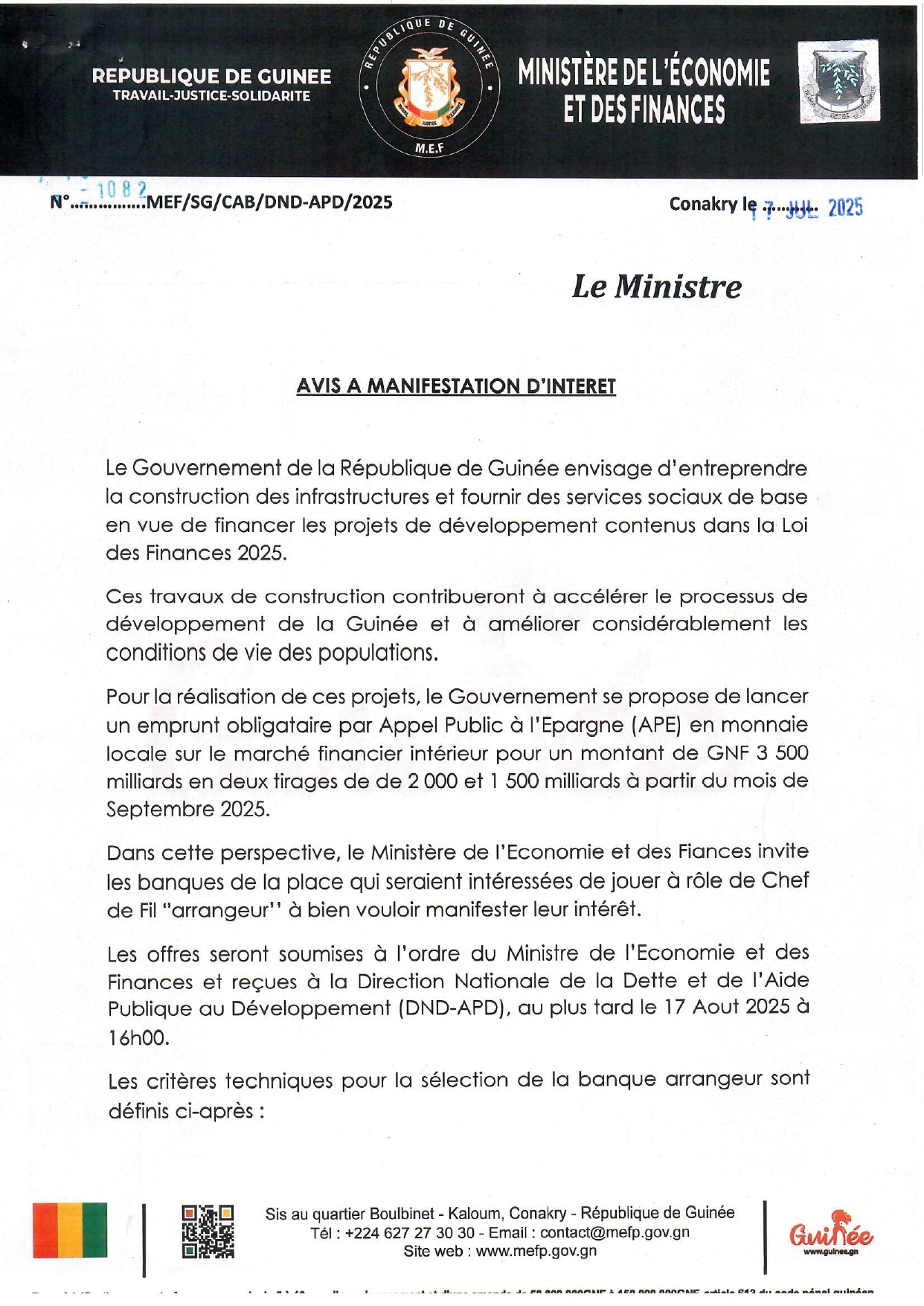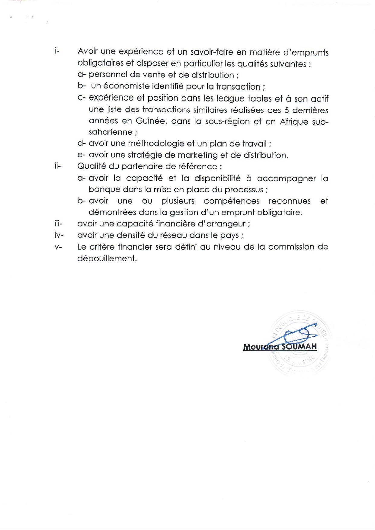> Invitation à soumissionner aux banques de la place qui seraient intéressées de jouer à rôle de Chef de Fil "arrangeur"