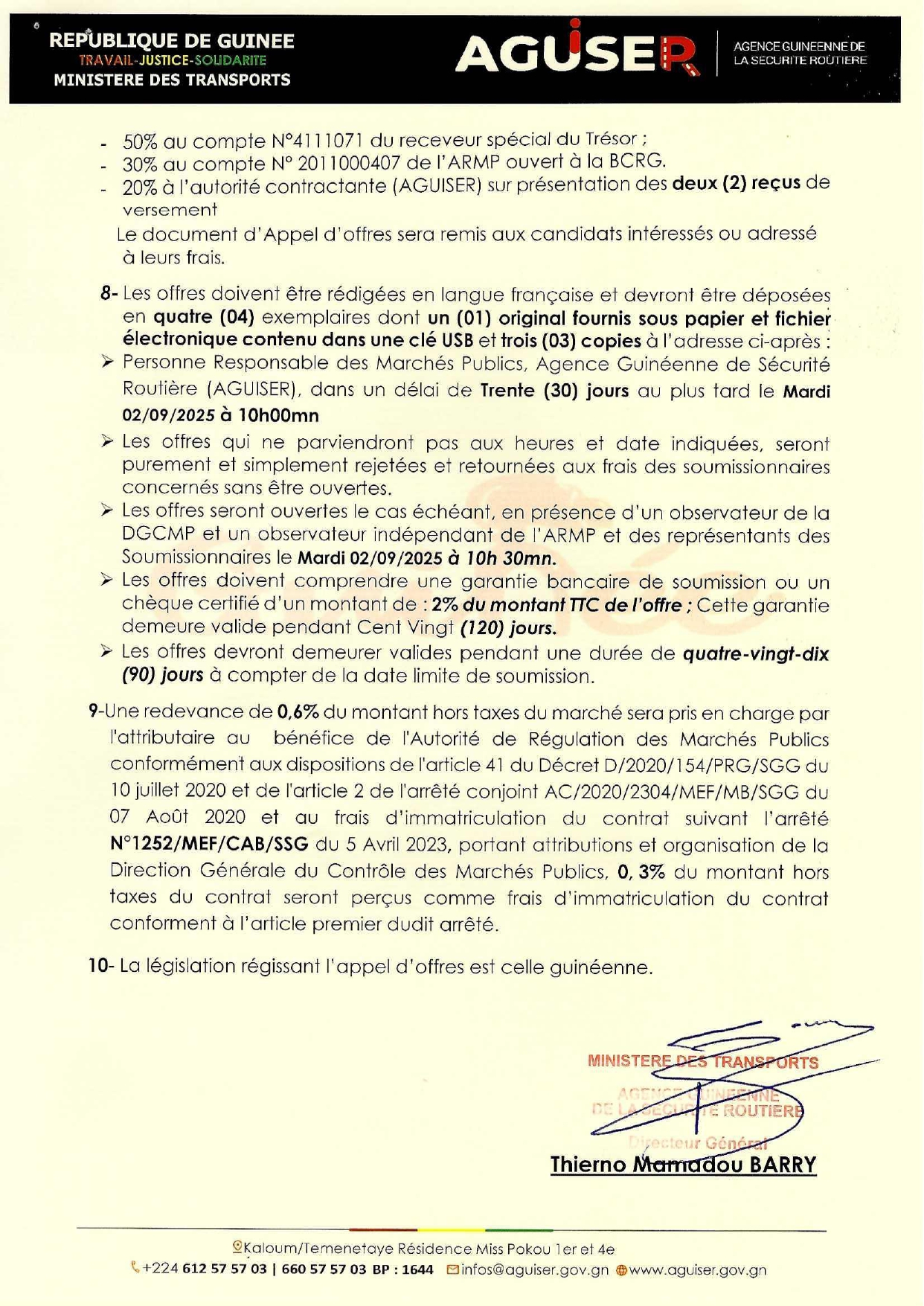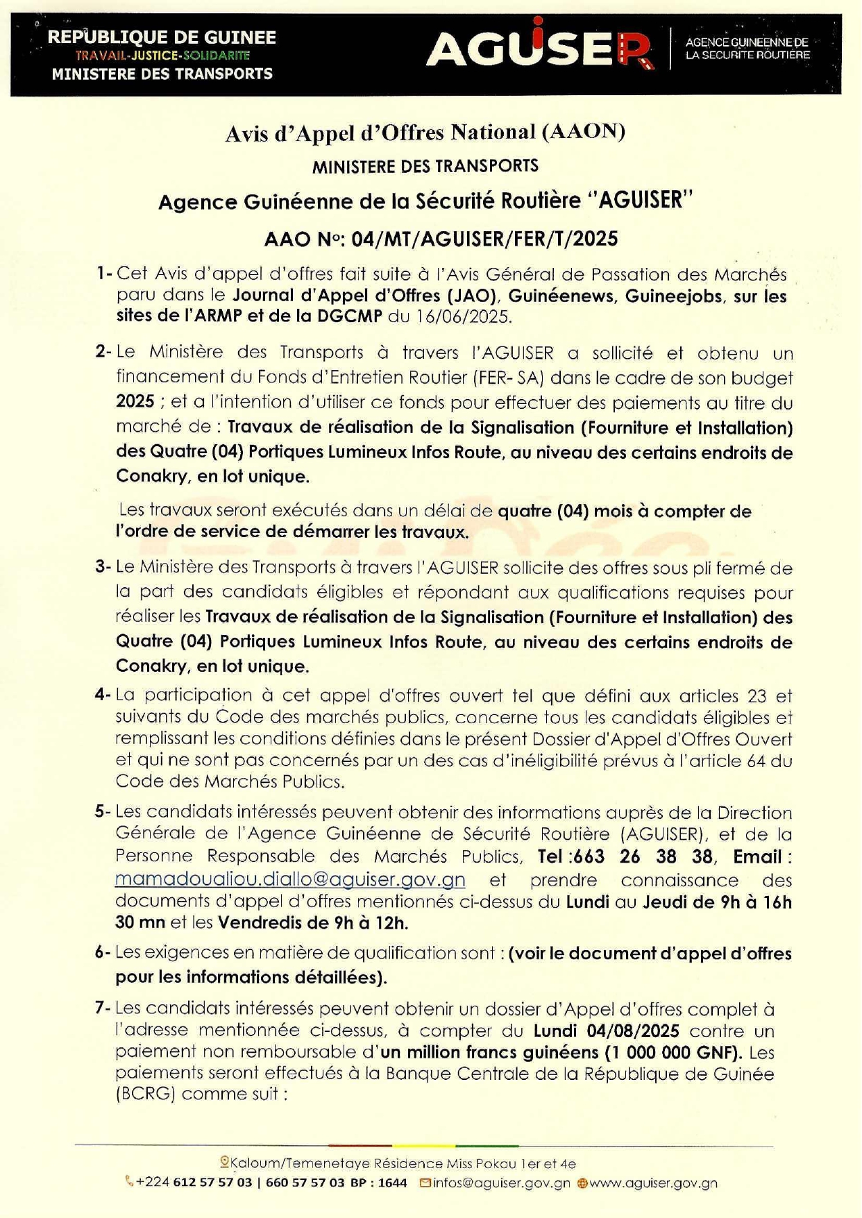 > Avis d'appel d'offres pour des Travaux de réalisation de la Signalisation (Fourniture et Installation) des Quatre (04) Portiques Lumineux Infos Route