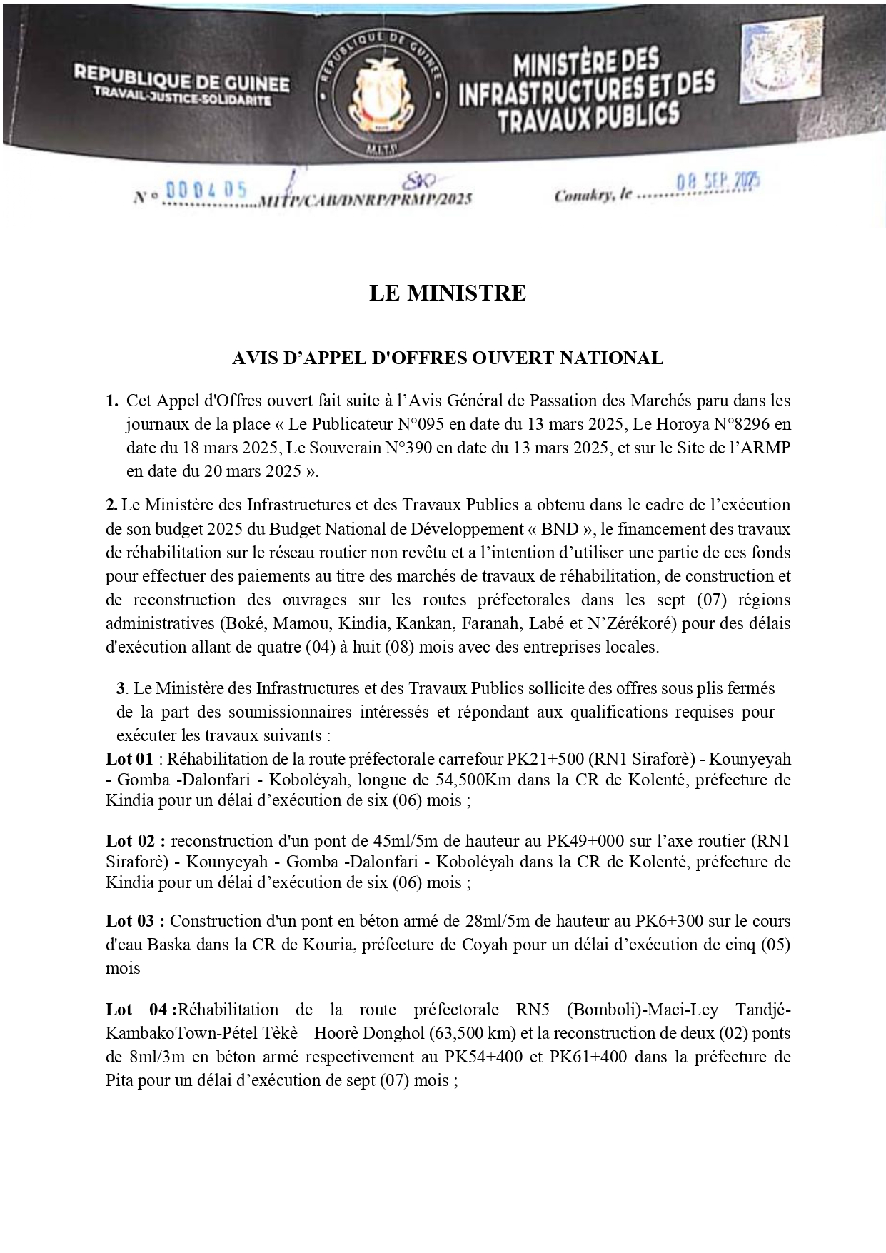 > Avis d'appel d'offres pour les marchés de travaux de réhabilitation, de construction et de reconstruction des ouvrages sur les routes préfectorales dans les sept (07) régions administratives (Boké, Mamou, Kindia, Kankan, Faranah, Labé et N’Zérékoré)