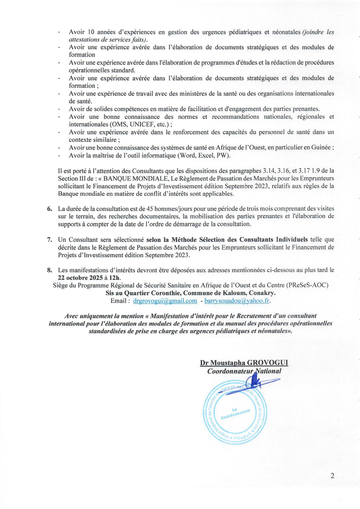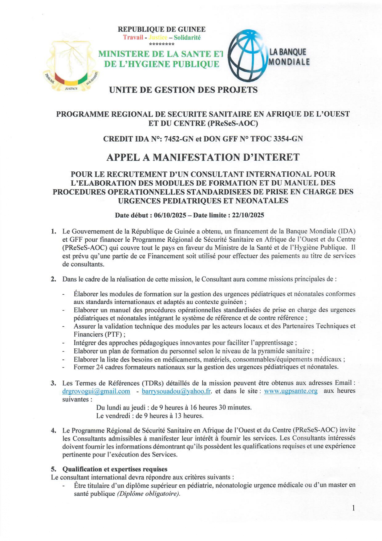 > APPEL A MANIFESTATION D’INTERET POUR LE RECRUTEMENT D’UN CONSULTANT INTERNATIONAL POUR L’ELABORATION DES MODULES DE FORMATION ET DU MANUEL DES PROCEDURES OPERATIONNELLES STANDARDISEES DE PRISE EN CHARGE DES URGENCES PEDIATRIQUES ET NEONATALES