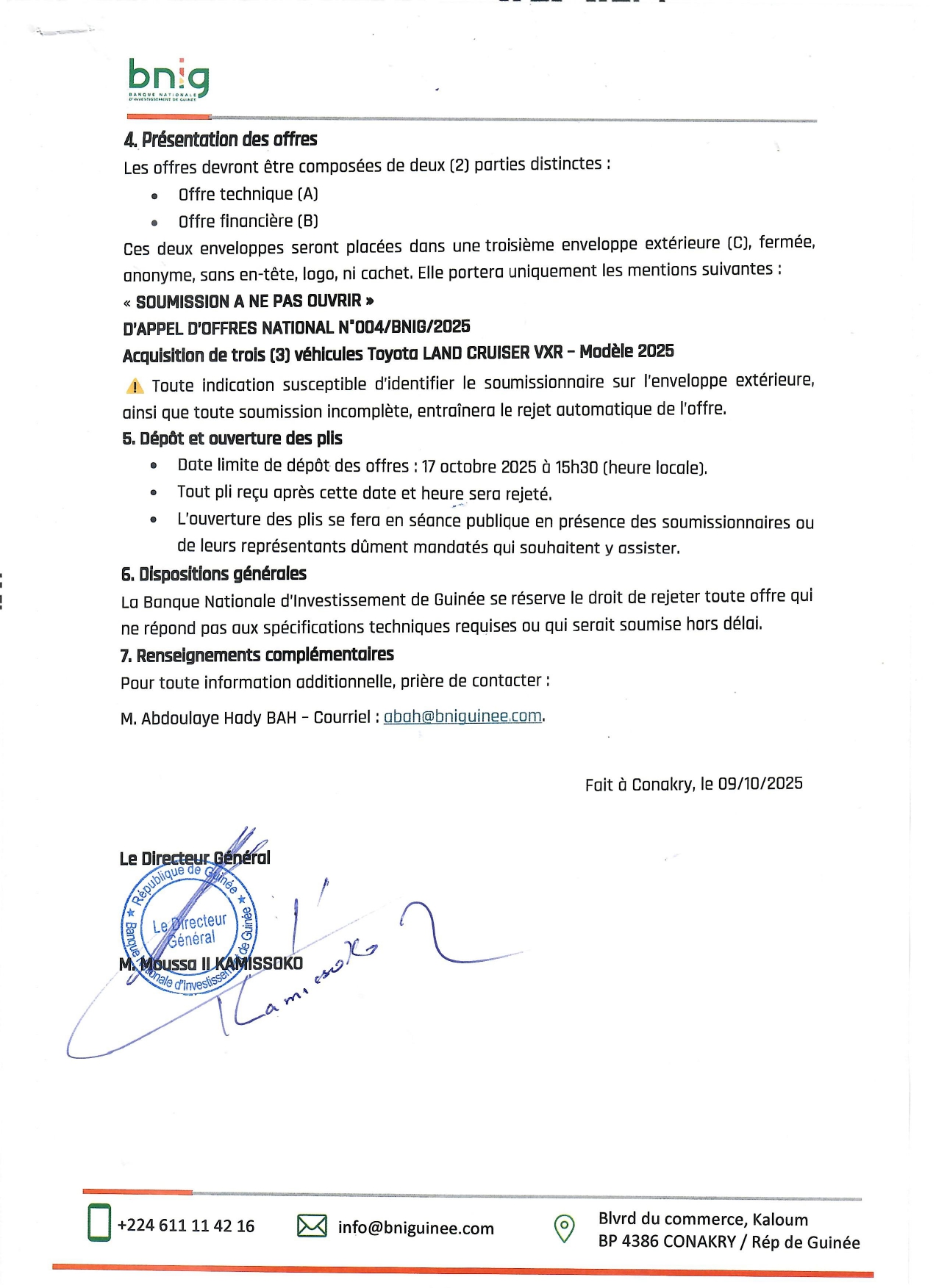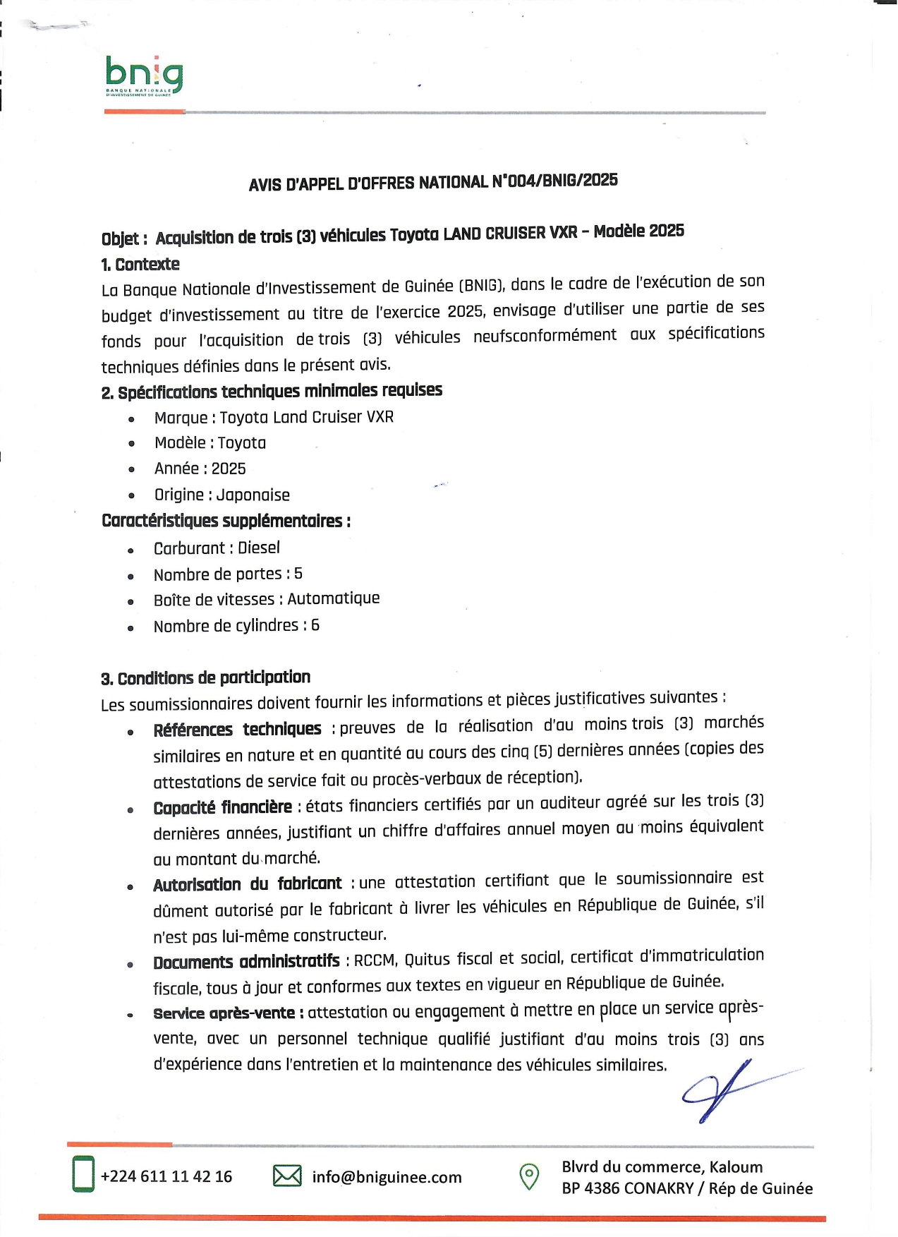 > Avis d'appel d'offres pour l'Acquisition de trois (3) véhicules Toyota LAND CRUISER VXR - Modèle 2025