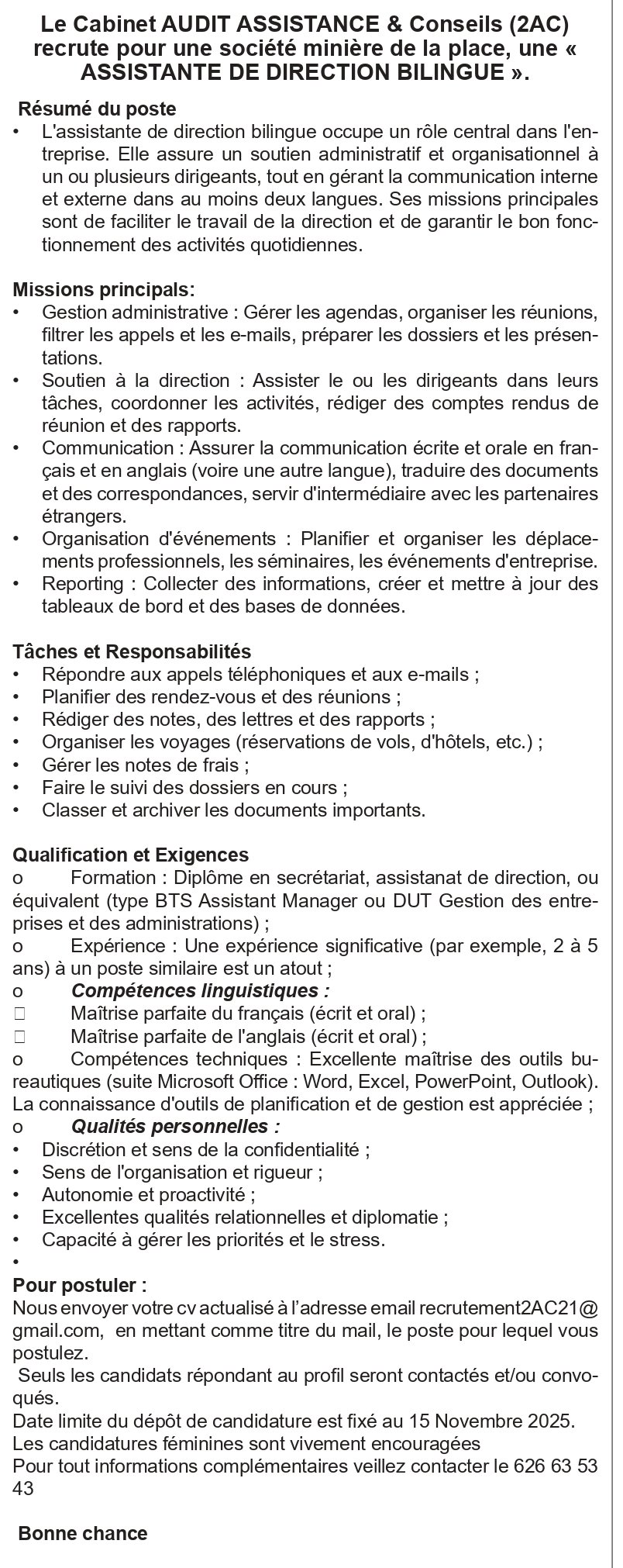 > AVIS DE RECRUTEMENT D'UNE ASSISTANTE DE DIRECTION BILINGUE