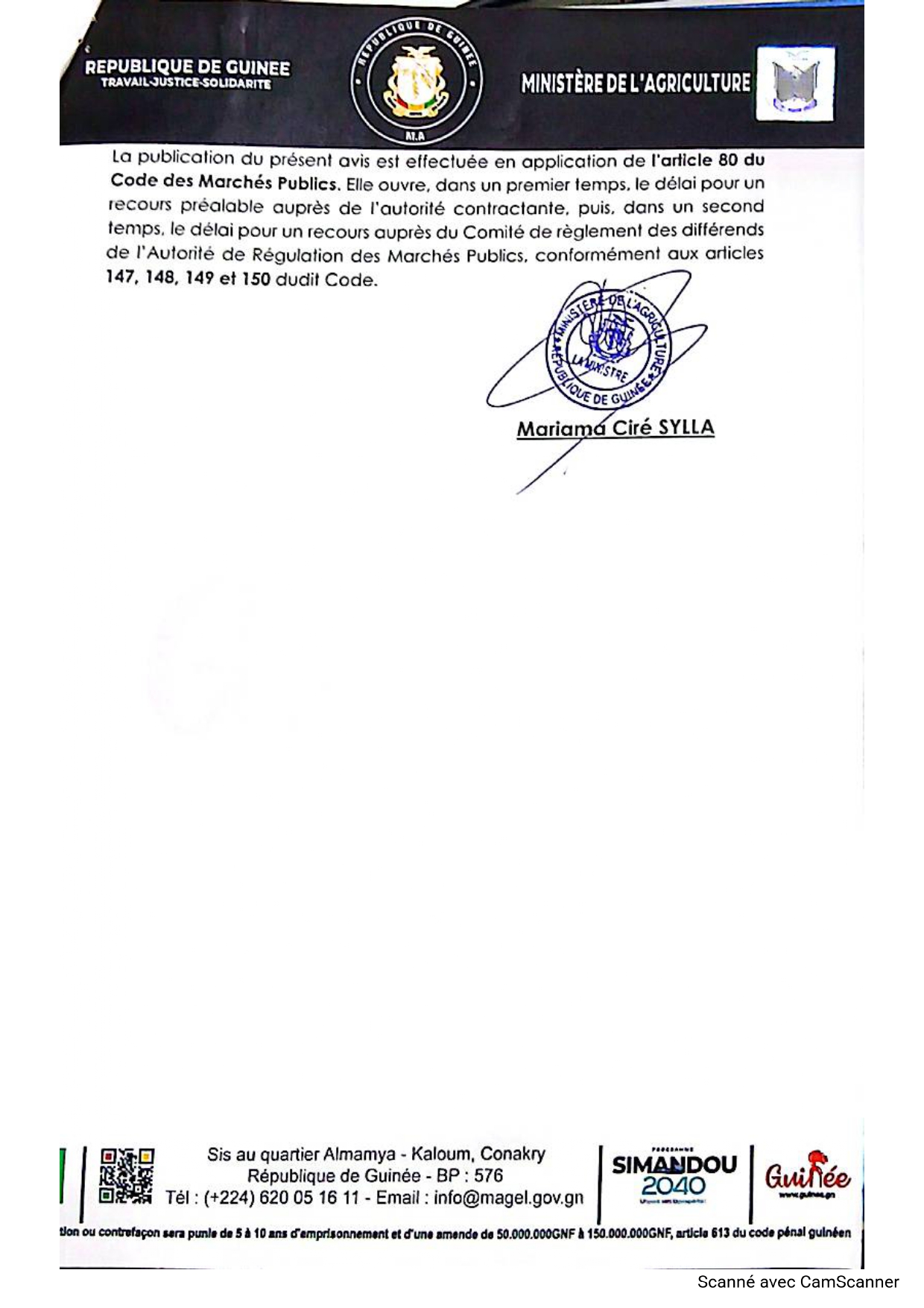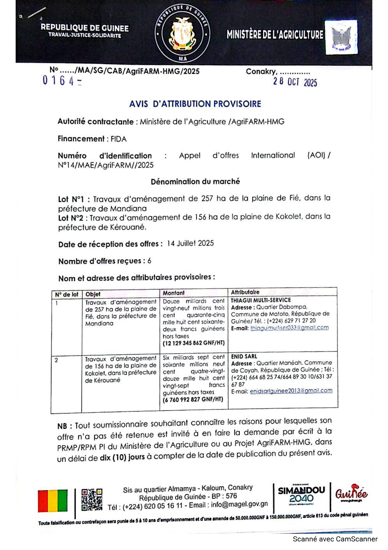 > Avis d'attribution provisoire: Travaux d'aménagement de 257 ha de la plaine de Fié, dans la préfecture de Mandiana