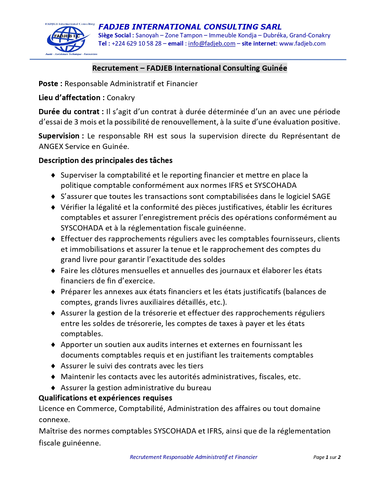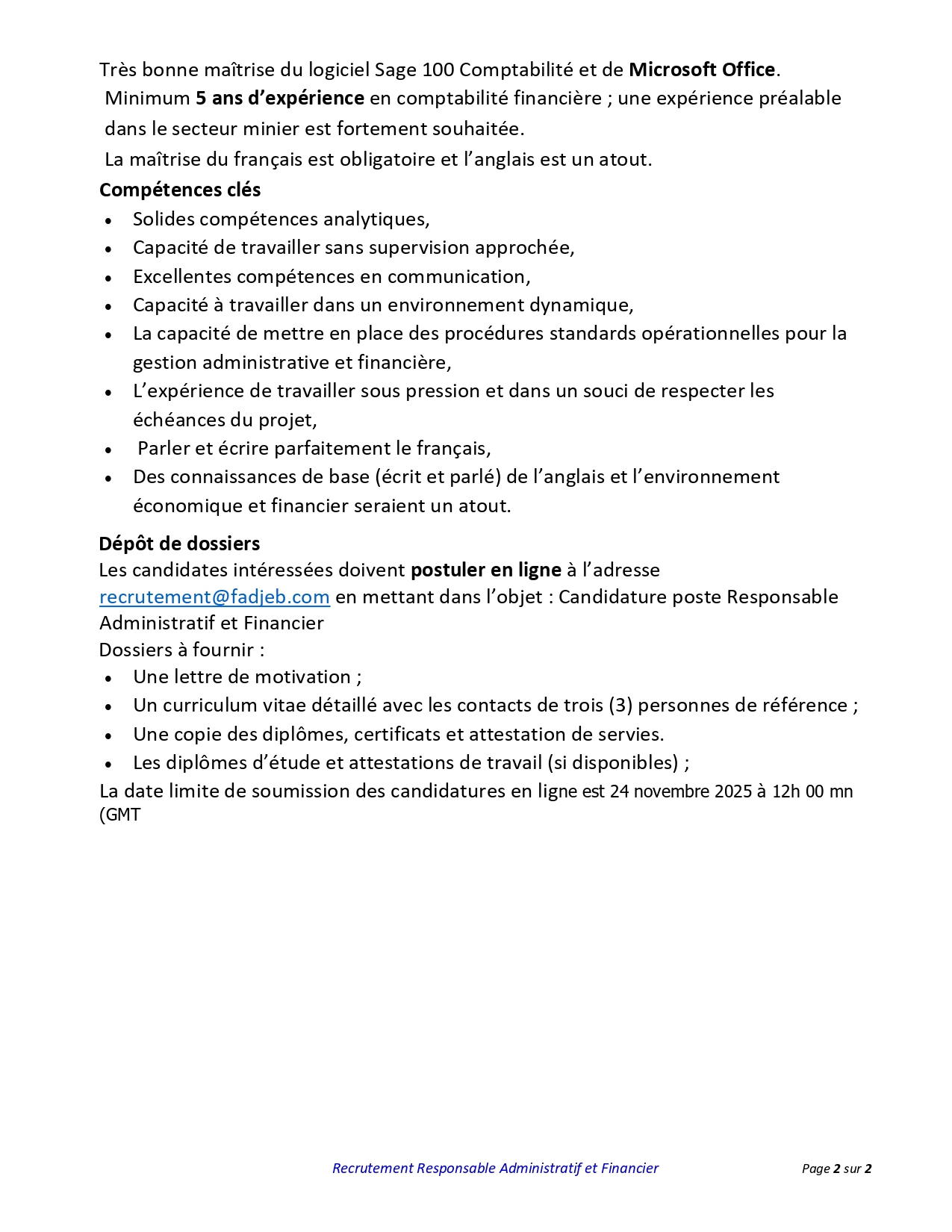 > Avis De Recrutement D'un Responsable Administratif et Financier