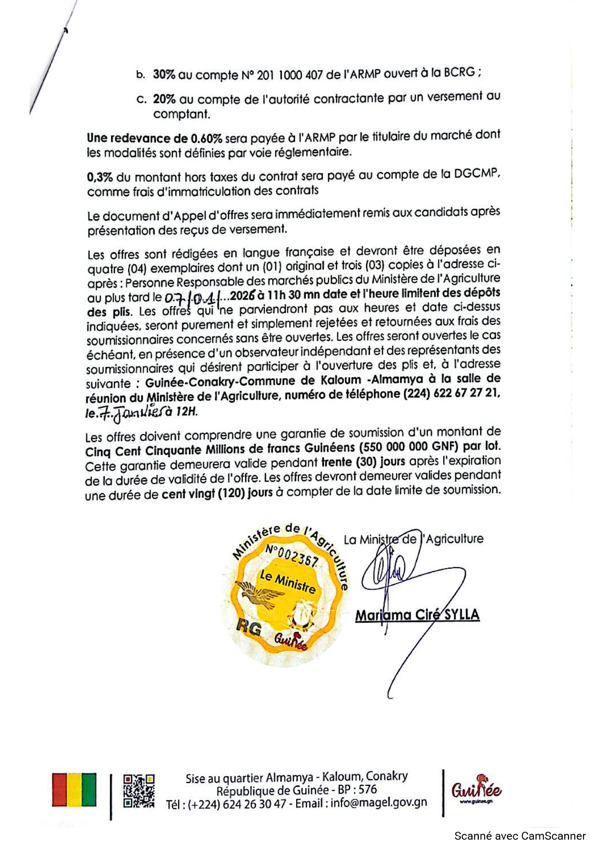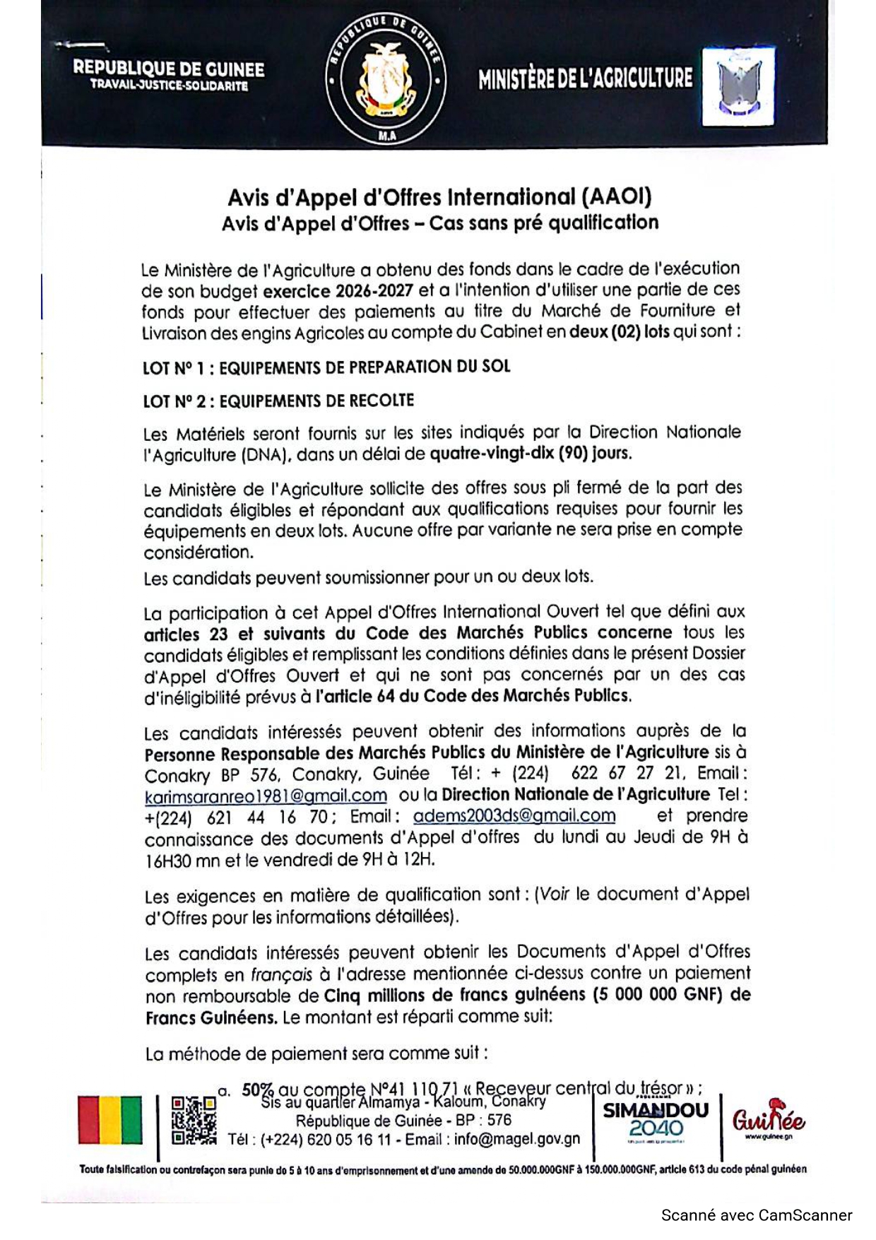 > Avis d'appel d'offres pour le Marché de Fourniture et Livraison des engins Agricoles au compte du Cabinet en deux (02) lots