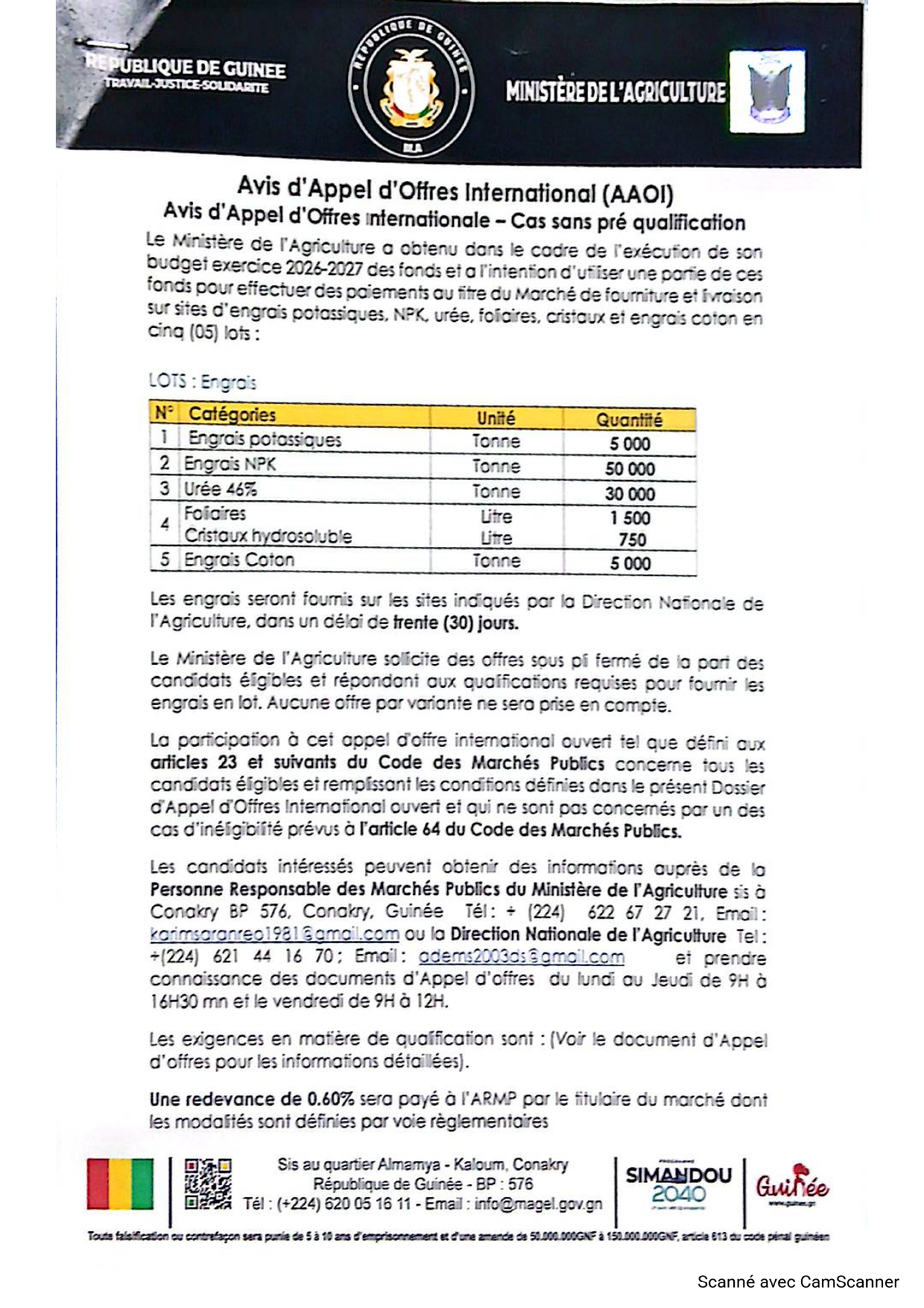 > Avis d'appel d'offres pour le Marché de fourniture et livraison sur sites d’engrais potassiques, NPK, urée, foliaires, cristaux et engrais coton en cinq (05) lots