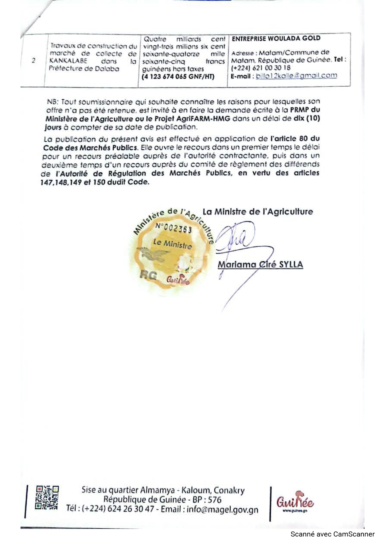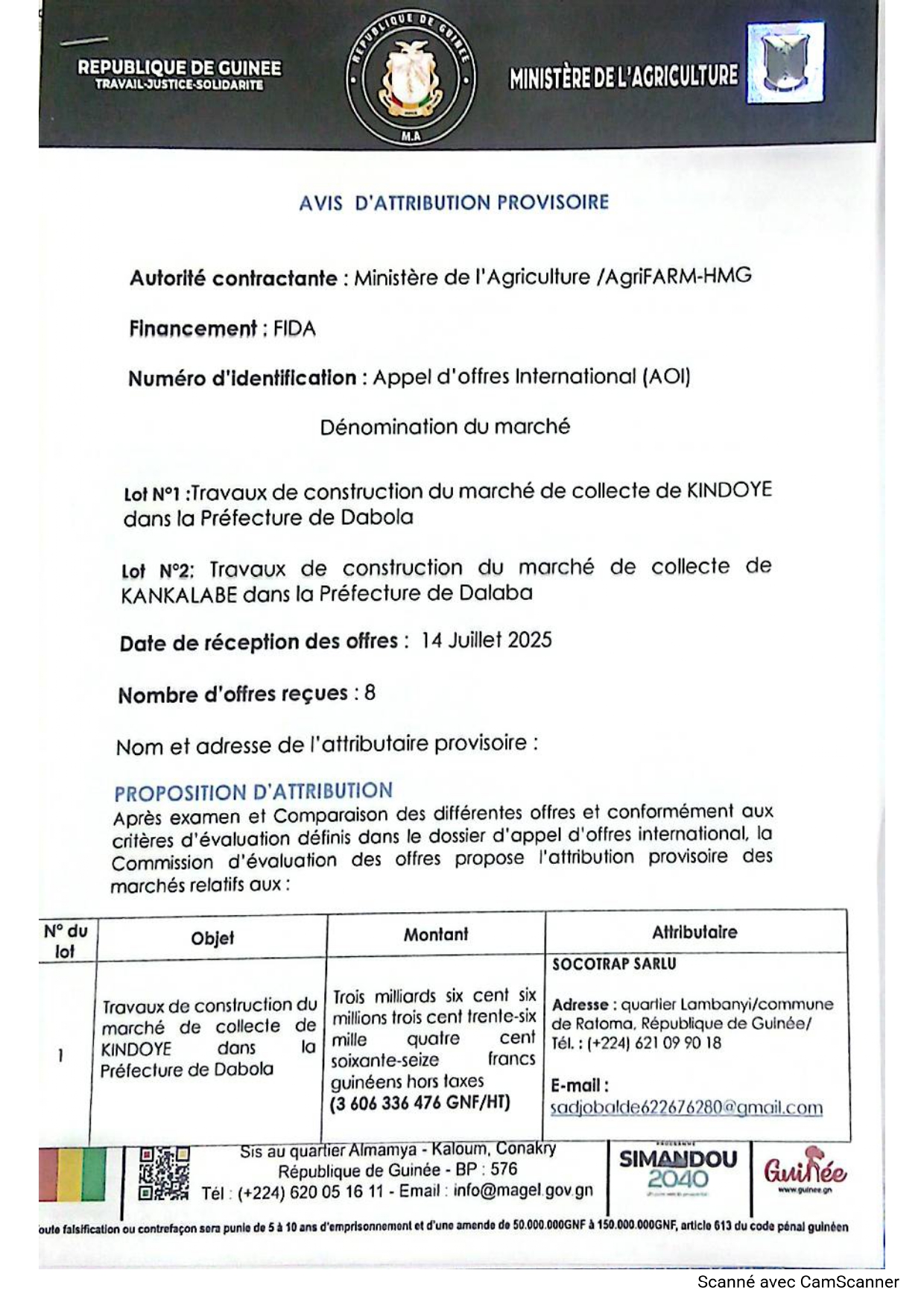 > AVIS D'ATTRIBUTION PROVISOIRE : Appel d'offres International (A01) Dénomination du marché Lot N°1 :Travaux de construction du marché de collecte de KINDOYE dans la Préfecture de Dabola Lot N°2: Travaux de construction du marché de collecte de KANKALABE dans la Préfecture de Dalaba