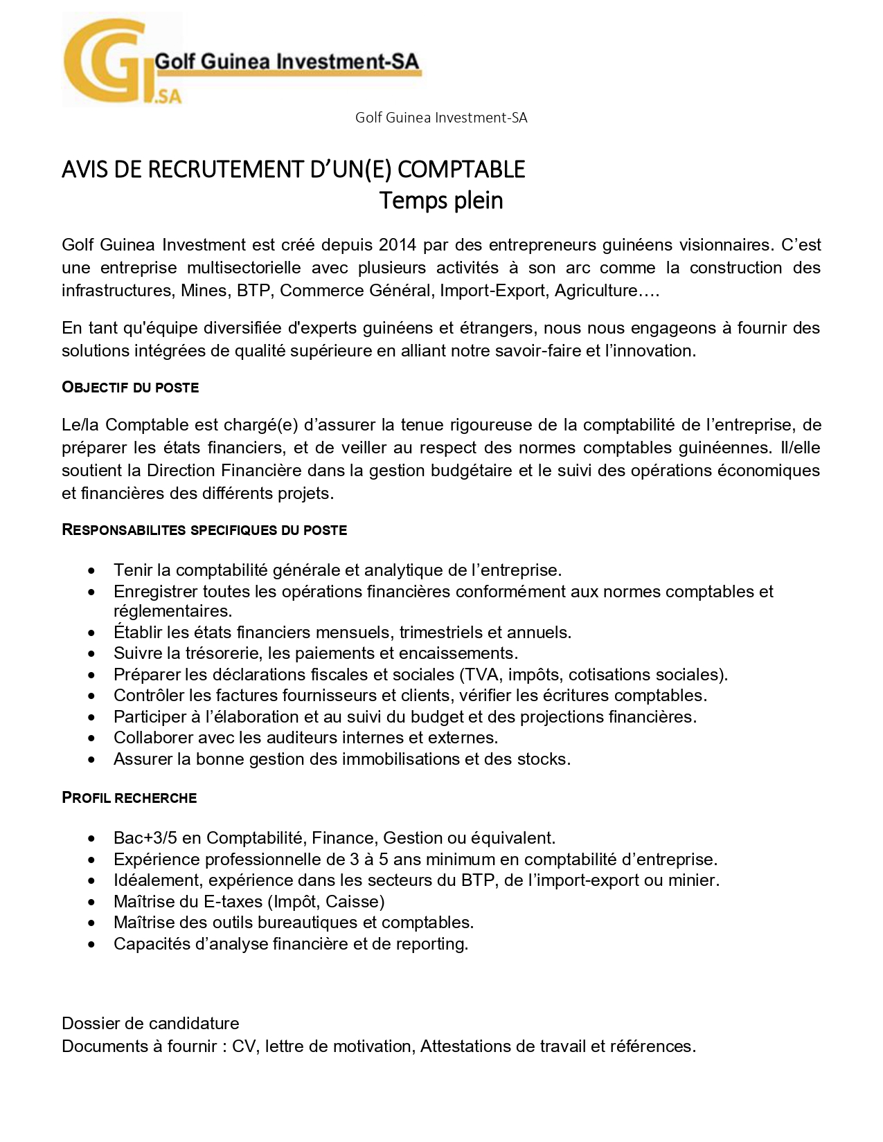 > AVIS DE RECRUTEMENT D’UN(E) COMPTABLE