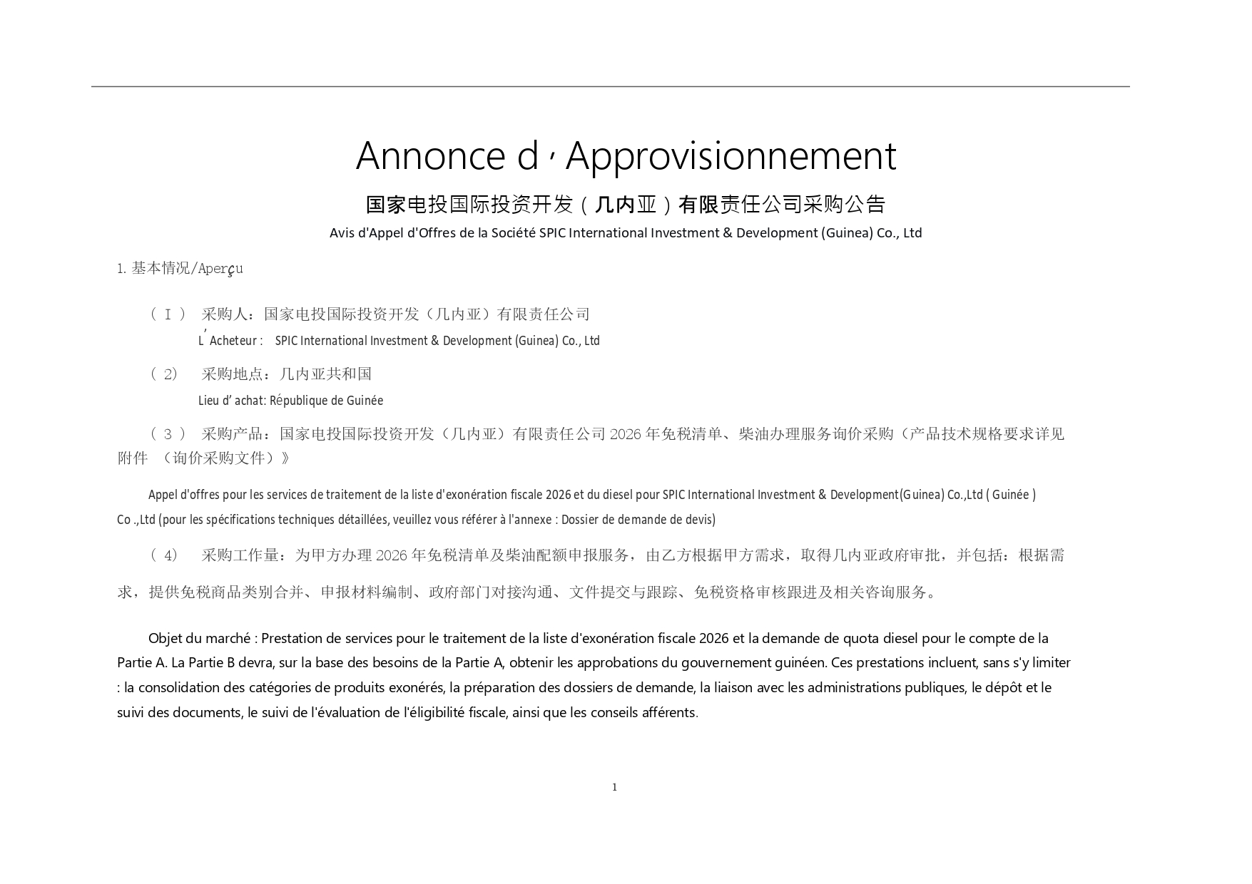 > Appel d'offres pour les services de traitement de la liste d'exonération fiscale 2026 et du diesel pour SPIC International Investment & Development(Guinea) Co.,Ltd ( Guinée ) Co .,Ltd
