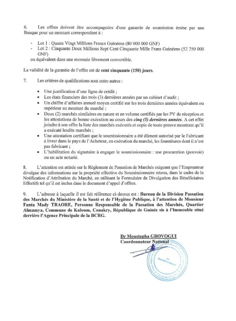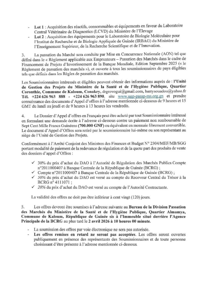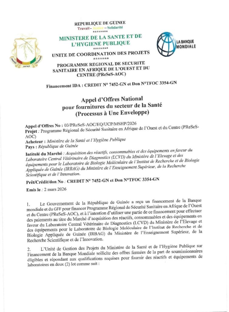 Avis d’appel d’offres ouvert pour l’Acquisition des réactifs, consommables et des équipe ments en faveur du Laboratoire Central Vétérinaire de Diagnostics (LCVD)