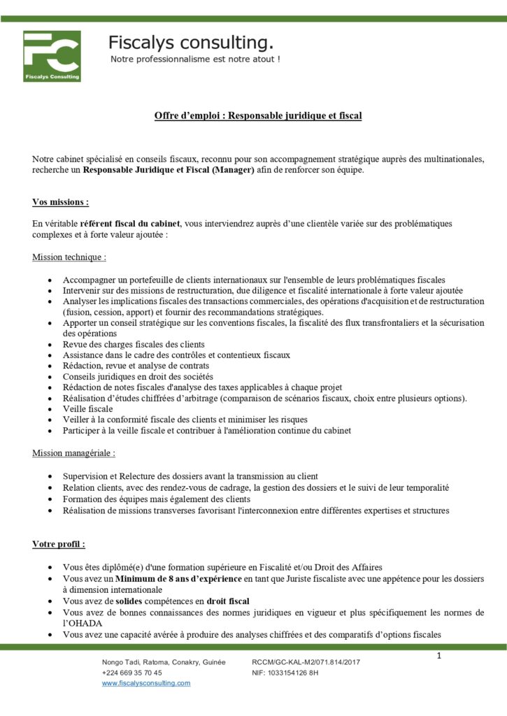 Avis de recrutement d’un responsable juridique et fiscal