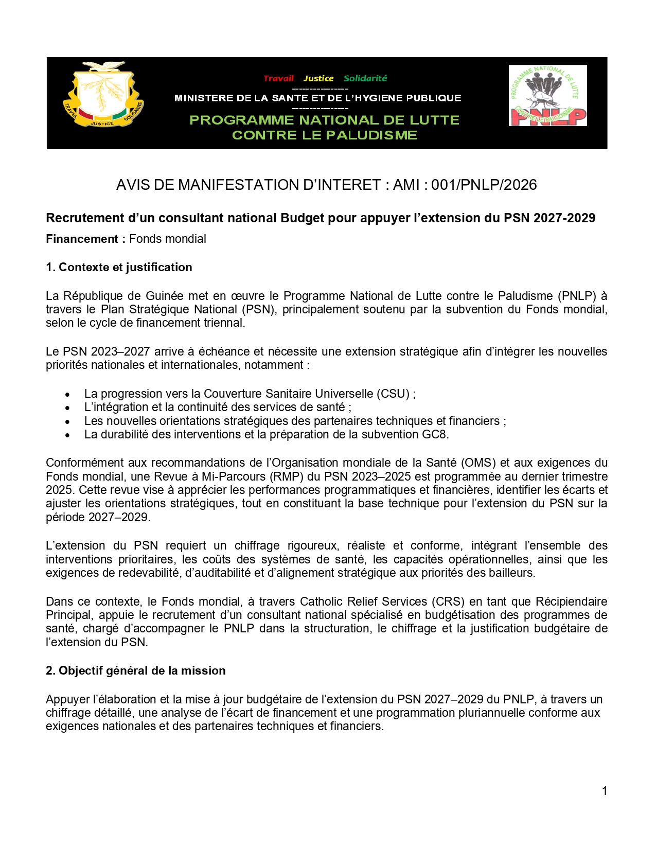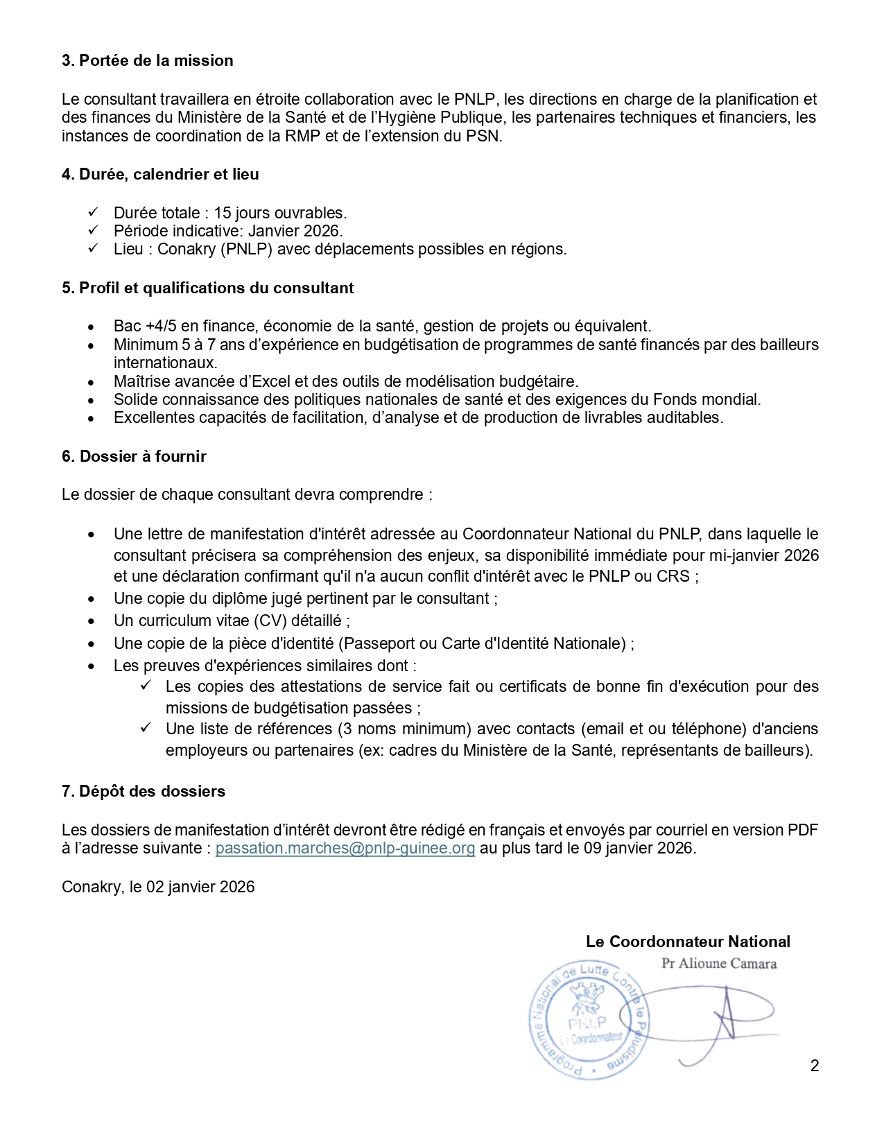 AVIS DE MANIFESTATION D’INTERET Pour Le Recrutement d’un consultant national Budget pour appuyer l’extension du PSN 2027-2029