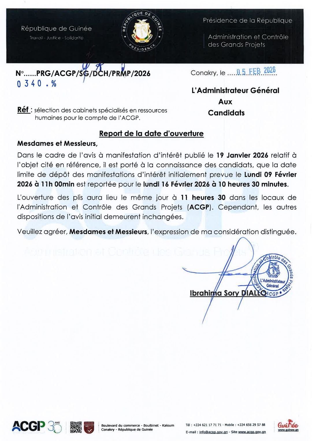 Avis de report de la date d’ouverture: sélection des cabinets spécialisés en ressources humaines pour le compte de l’ACGP