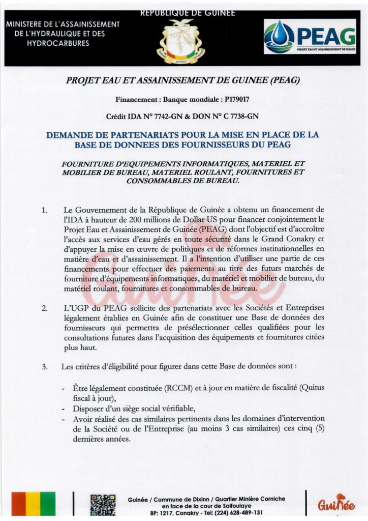 DEMANDE DE PARTENARIATS POUR LA MISE EN PLACE DE LABASE DE DONNEES DES FOURNISSEURS DU PEAG