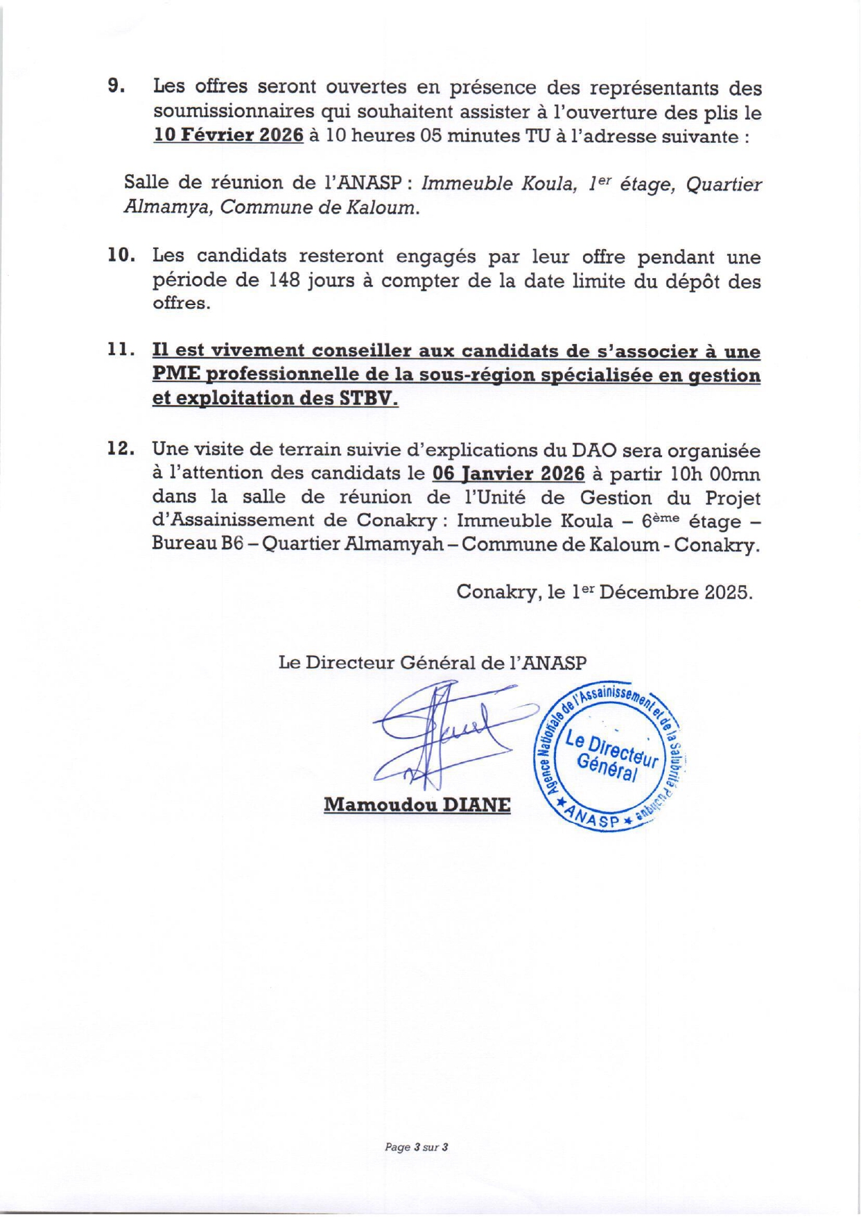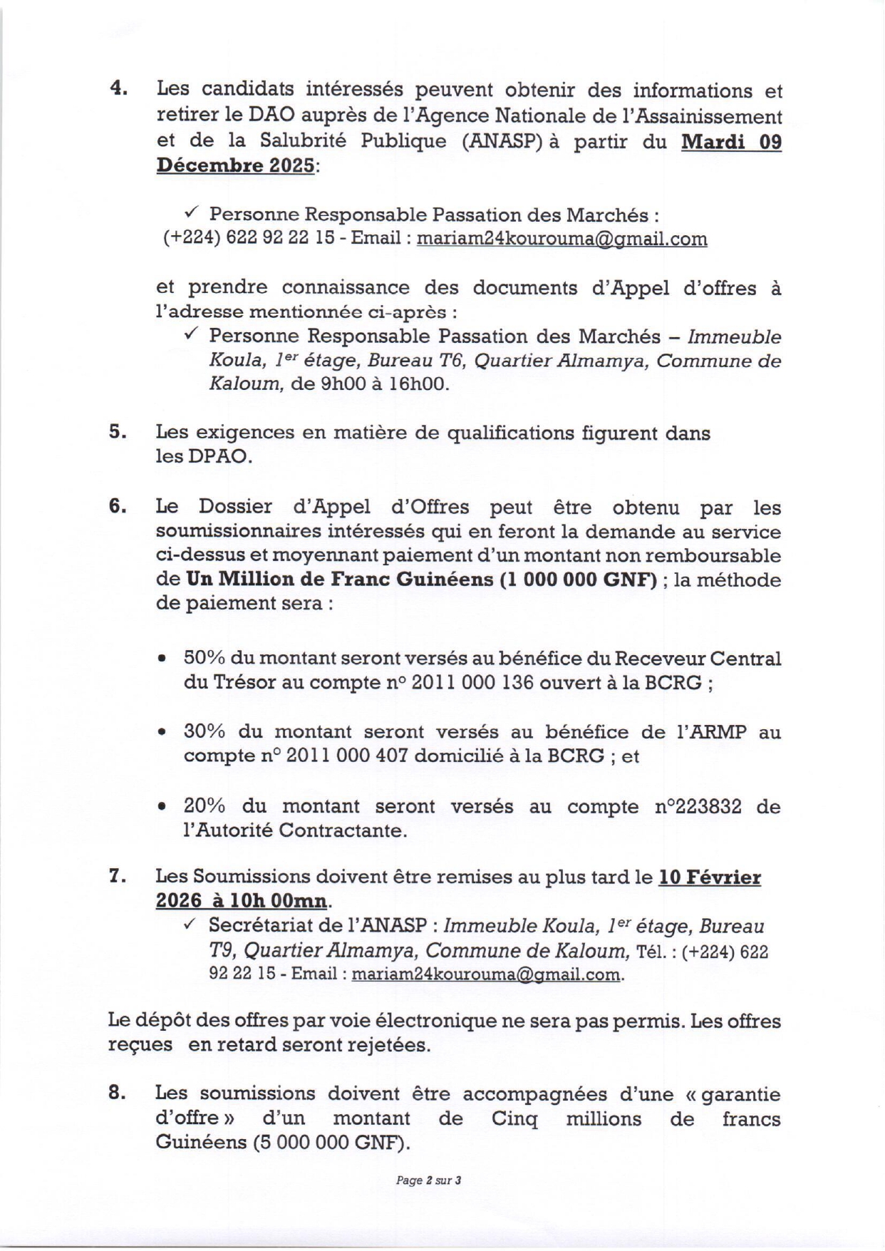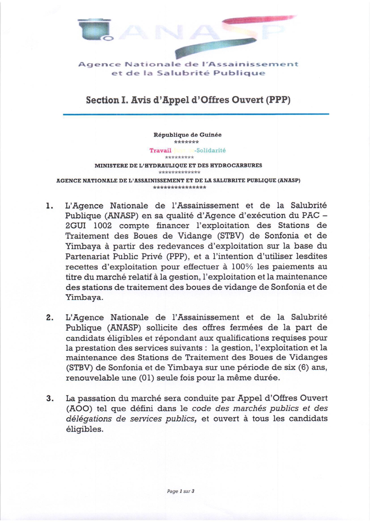 Avis d’appel d’offres pour le marché relatif à la gestion, l’exploitation et la maintenance des stations de traitement des boues de vidange de Sonfonia