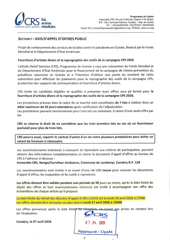 Avis de publication du DAO relatif à la fourniture d’articles divers et la reprographie des outils de la campagne CPS 2026