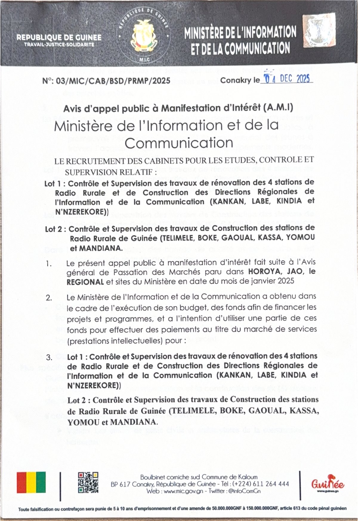 Télécharger l’avis complet en PDF: Avis à Manifestation Public relatif au recrutement des Cabinets pour la supervision et le Contrôle des 6 stations de Radios Rurales