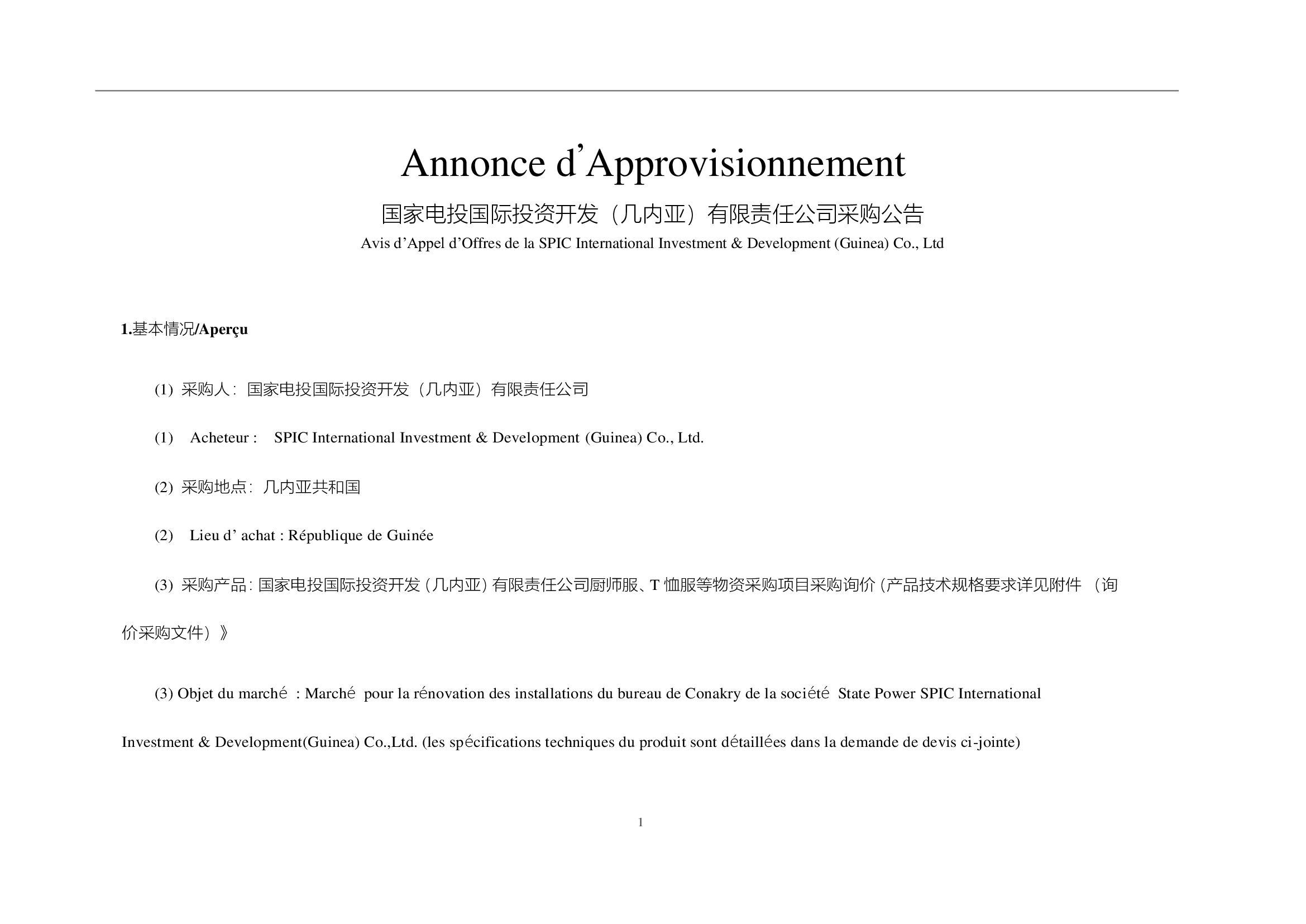 Télécharger l’avis complet: 0110annonce approvisionnement国家电投国际投资开发(几内亚)有限责任公司厨师服、T恤服等物资采购公告(通知)