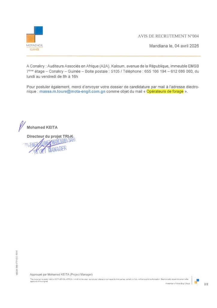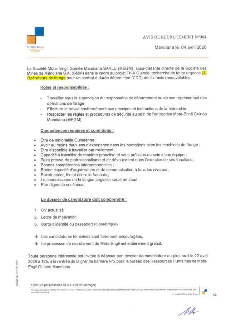 Avis de recrutement de (3)Opérateurs de forage pour un contrat à durée déterminée (CDD)