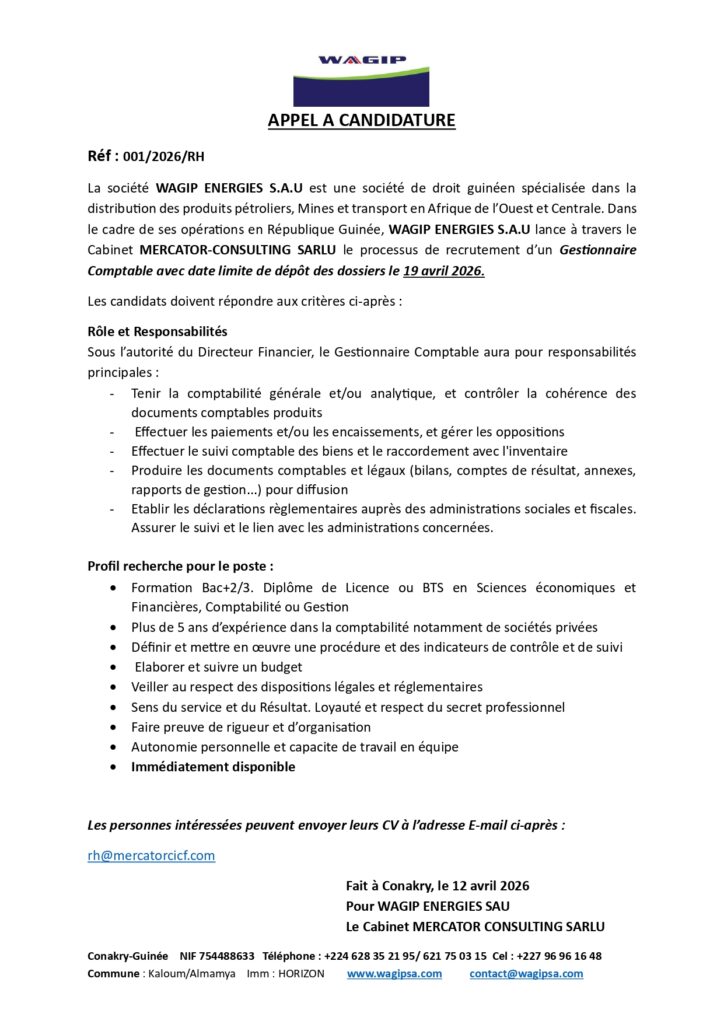 Avis de recrutement d’un Gestionnaire Comptable