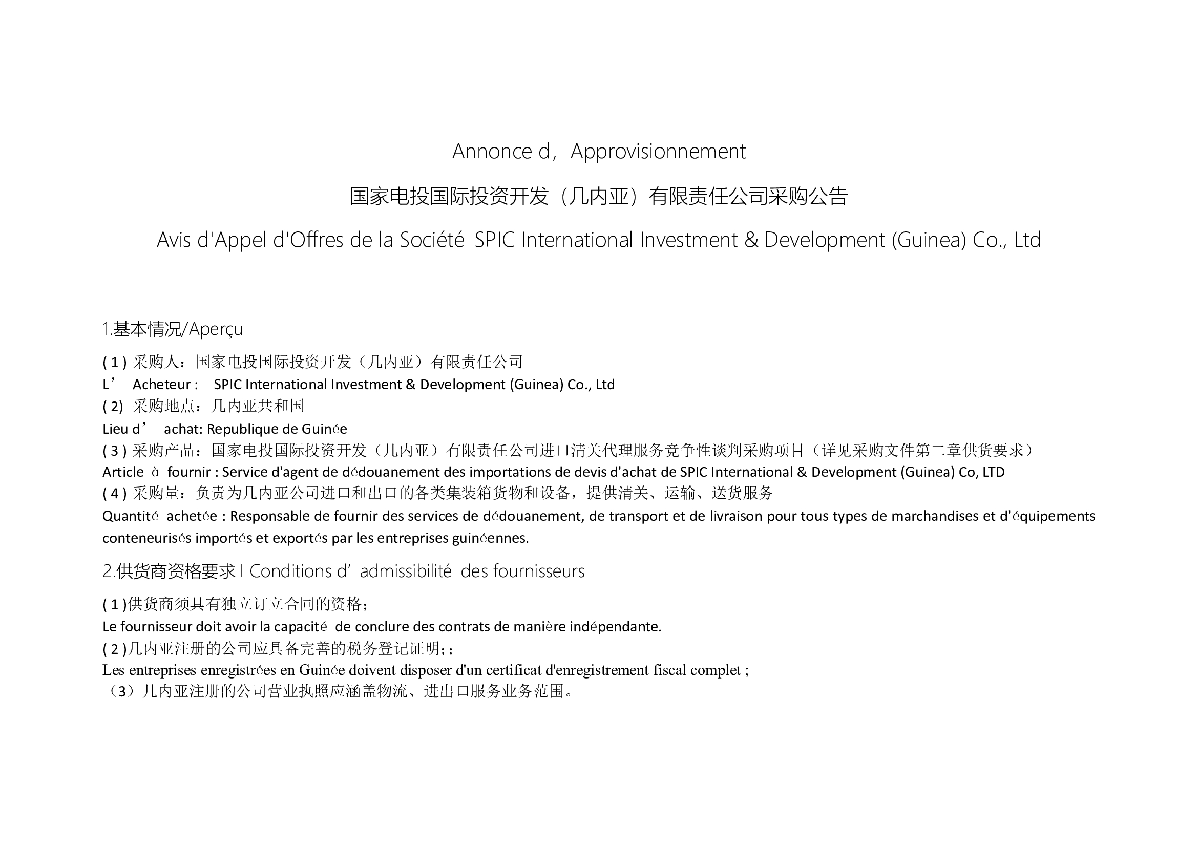 Annonce d’approvisionnement pour des Service d’agent de dédouanement des importations de devis d’achat de SPIC International & Development (Guinea) Co, LTD