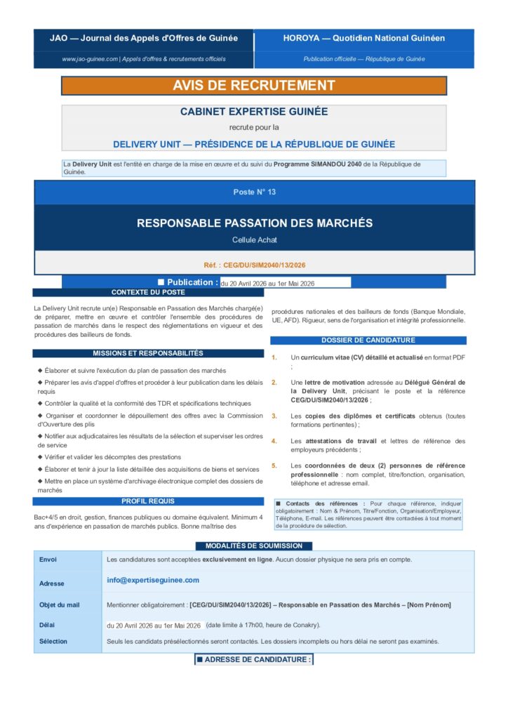 AVIS DE RECRUTEMENT D’UN RESPONSABLE PASSATION DES MARCHÉS