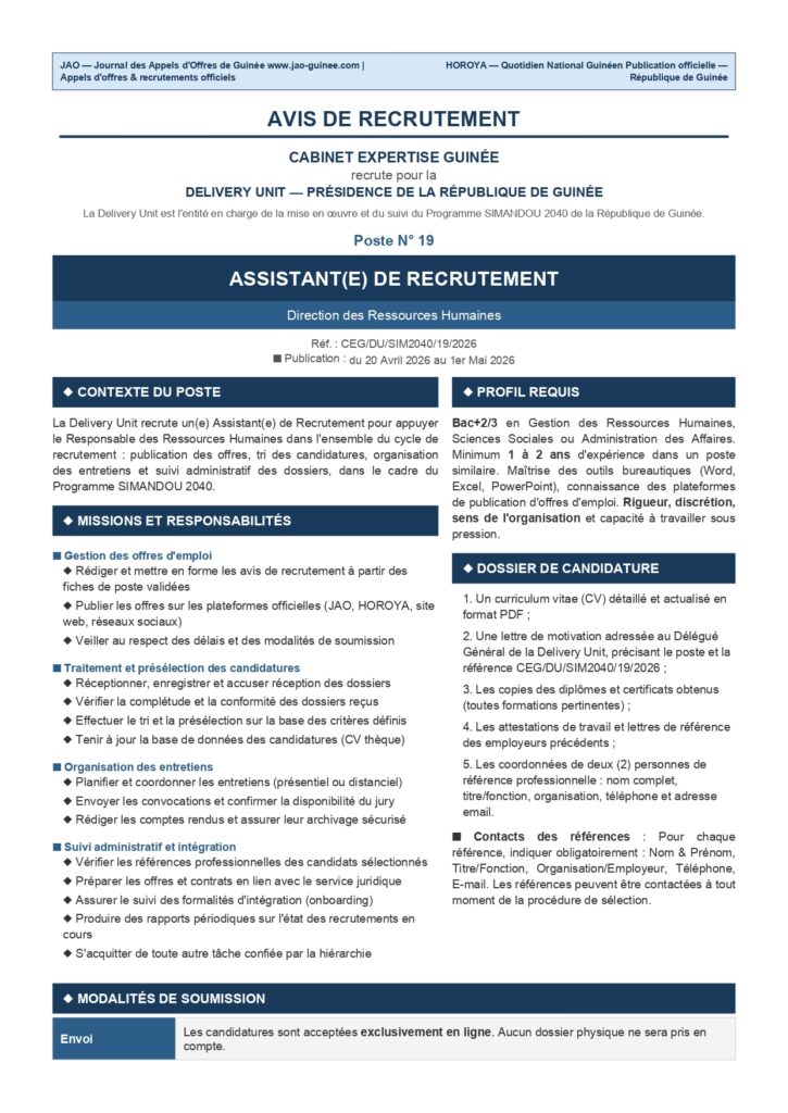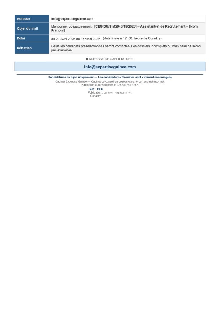 AVIS DE RECRUTEMENT D’UN(E) ASSISTANT(E) DE RECRUTEMENT