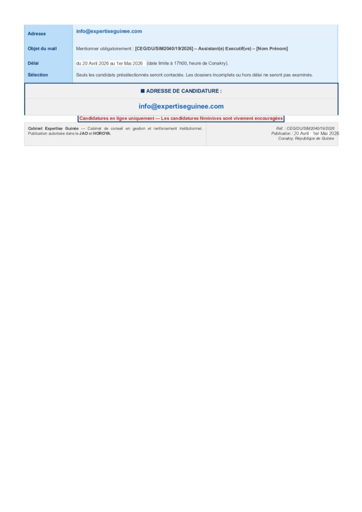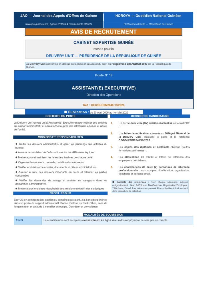 AVIS DE RECRUTEMENT D’UN(E) ASSISTANT(E) EXECUTIF(VE)