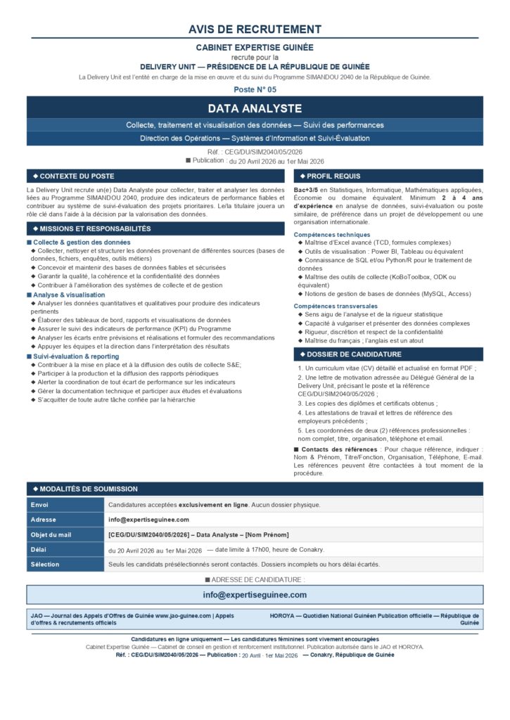 AVIS DE RECRUTEMENT D’UN(E) DATA ANALYSTE