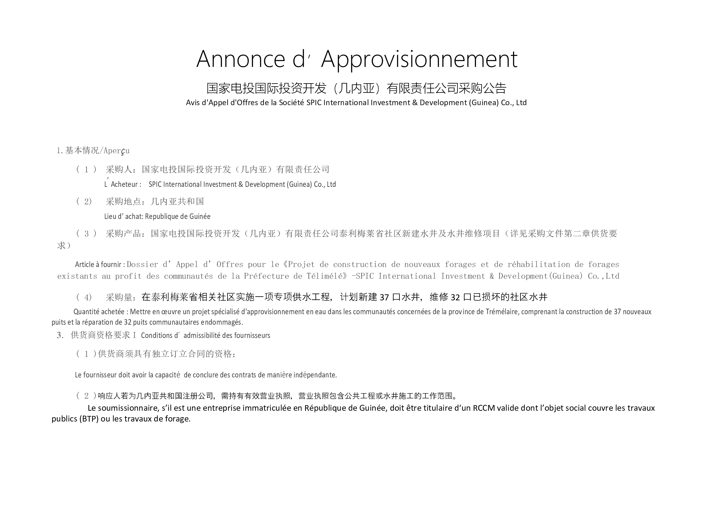 Dossier d’Appel d’Offres pour le Projet de construction de nouveaux forages et de réhabilitation de forages existants au profit des communautés de la Préfecture de Télimélé-SPIC