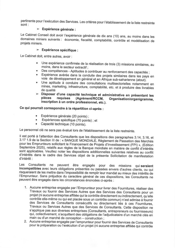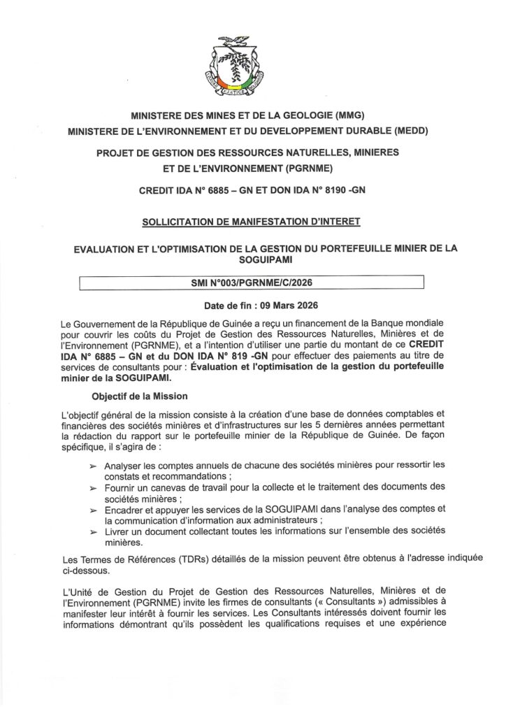 SOLLICITATION DE MANIFESTATION D’INTERET EVALUATION ET L’OPTIMISATION DE LA GESTION DU PORTEFEUILLE MINIER DE LA SOGUIPAMI