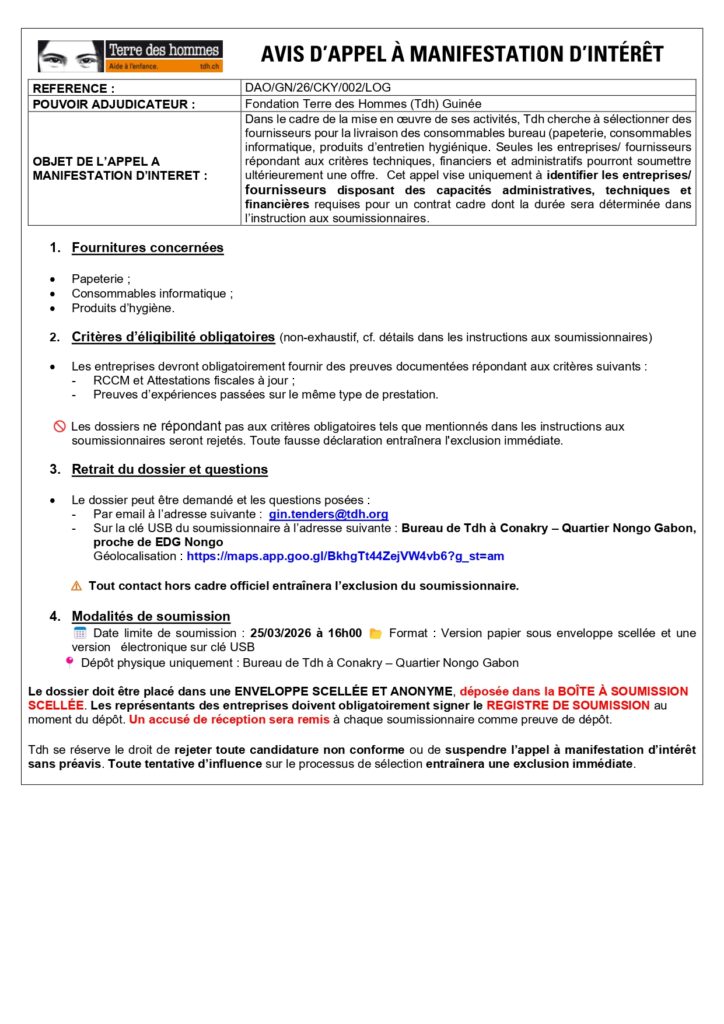 Avis d’appel à manifestation d’intérêt pour la séléction des fournisseurs pour la livraison des consommables bureau (papeterie, consommables informatique, produits d’entretien hygiénique.