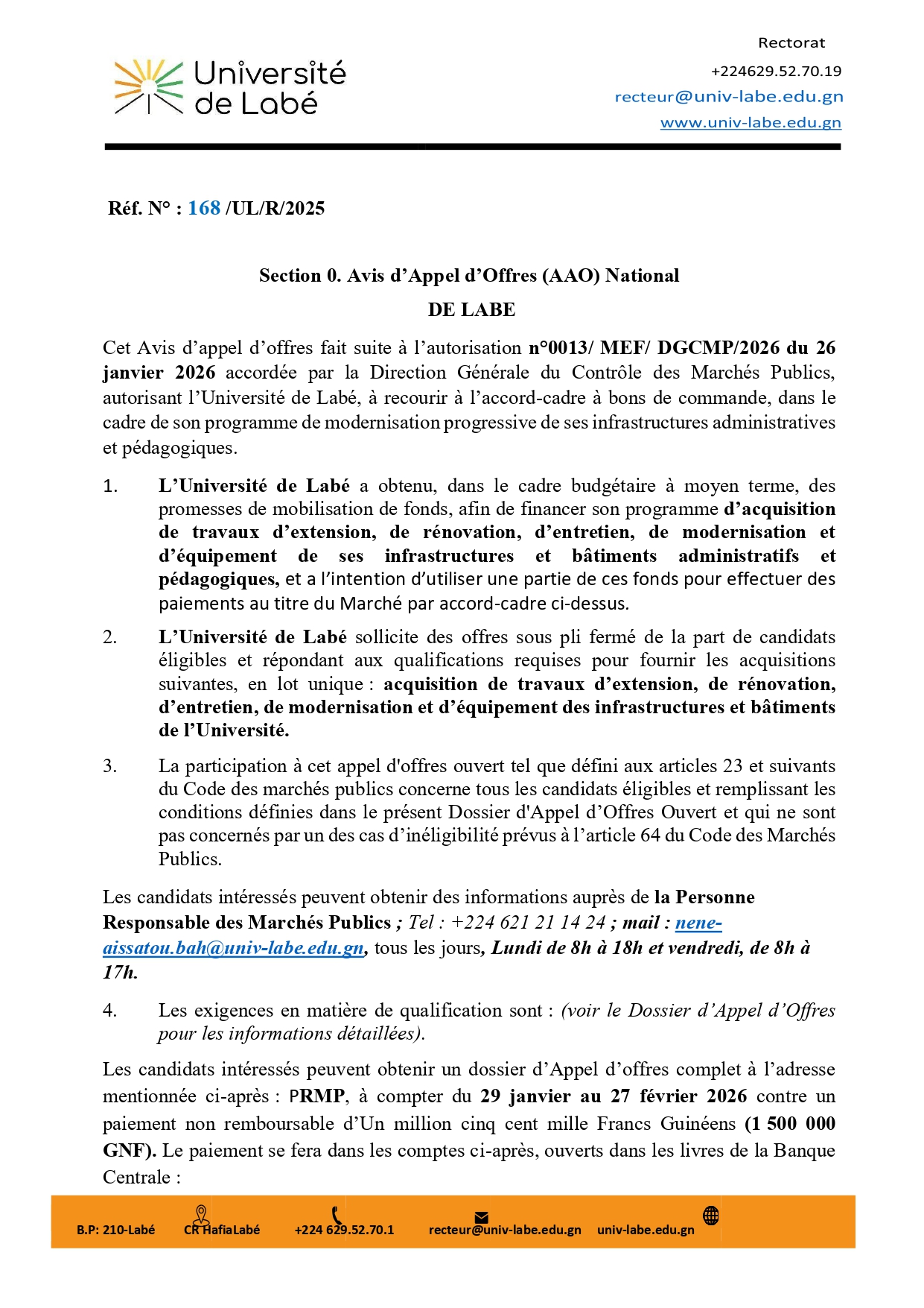 Le Journal des appels d’offres et offres d’emplois de Guinée est une plateforme dédiée à la publication et à la diffusion des appels d’offres publics et privés ainsi que des offres d’emplois en Guinée. Le site accompagne entreprises, institutions et professionnels dans leur recherche d’opportunités, en proposant un service actualisé et fiable pour rester informé des marchés et recrutements à travers le pays