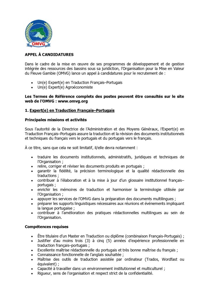 Avis d’appel d’offres pour le recrutement d’un(e) Expert(e) en Traduction Français–Portugais et Un(e) Expert(e) Agroéconomiste