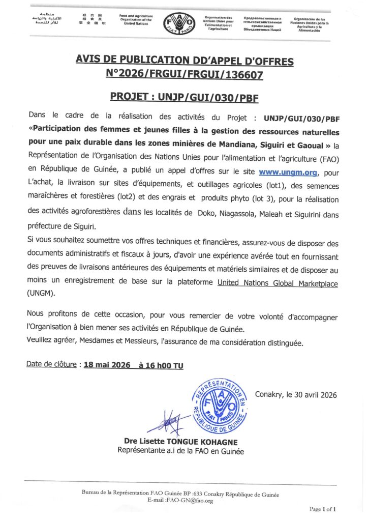 Avis d’appel d’offres pour la réalisation des activités du Projet : Participation des femmes et jeunes filles à la gestion des ressources naturelles pour une paix durable dans les zones minières de Mandiana, Siguiri et Gaoual »