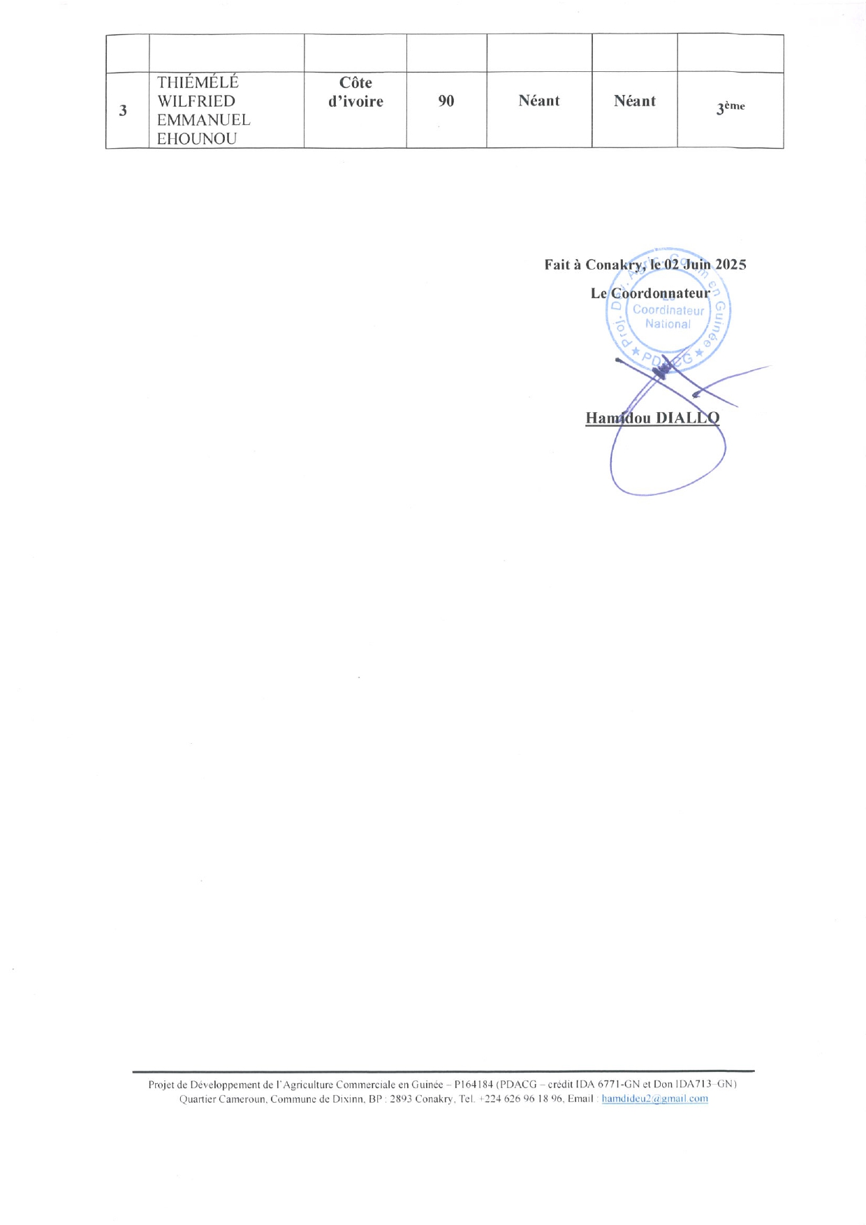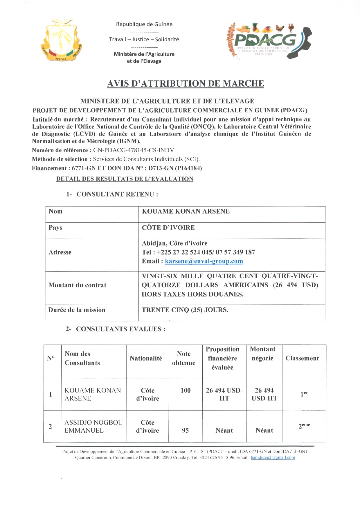 > Avis d'attribution de marché pour le Recrutement d’un Consultant Individuel pour une mission d’appui technique au Laboratoire de l'Office National de Contrôle de la Qualité (ONCQ), le Laboratoire Central Vétérinaire de Diagnostic (LCVD) de Guinée et au Laboratoire d’analyse chimique de l’Institut Guinéen de Normalisation et de Métrologie (IGNM).