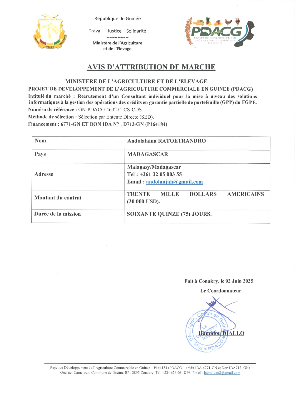 > Avis d'attribution de marché pour le Recrutement d’un Consultant individuel pour la mise à niveau des solutions informatiques à la gestion des opérations des crédits en garantie partielle de portefeuille (GPP) du FGPE