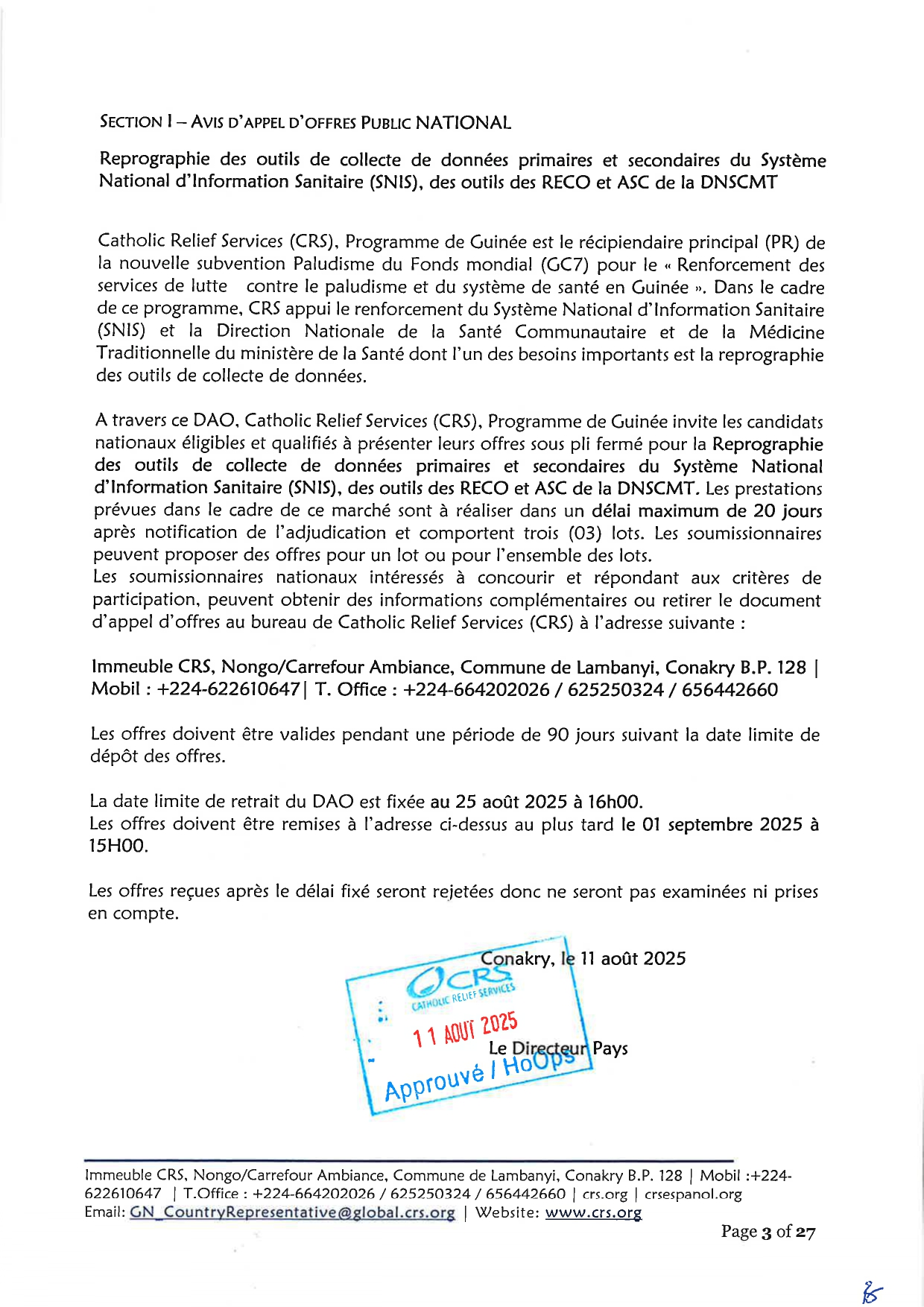 > Avis de publication du DAO relatif à la réprographie des outils de collecte de données primaires et secondaires du système national d'information sanitaire (SNIS),des outils des RECO et ASC de la DNSCMT