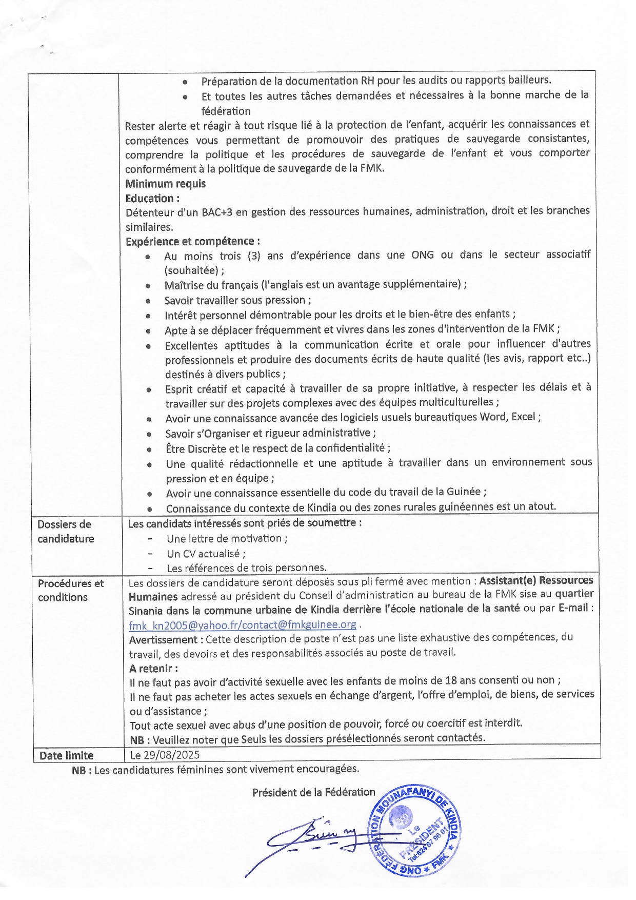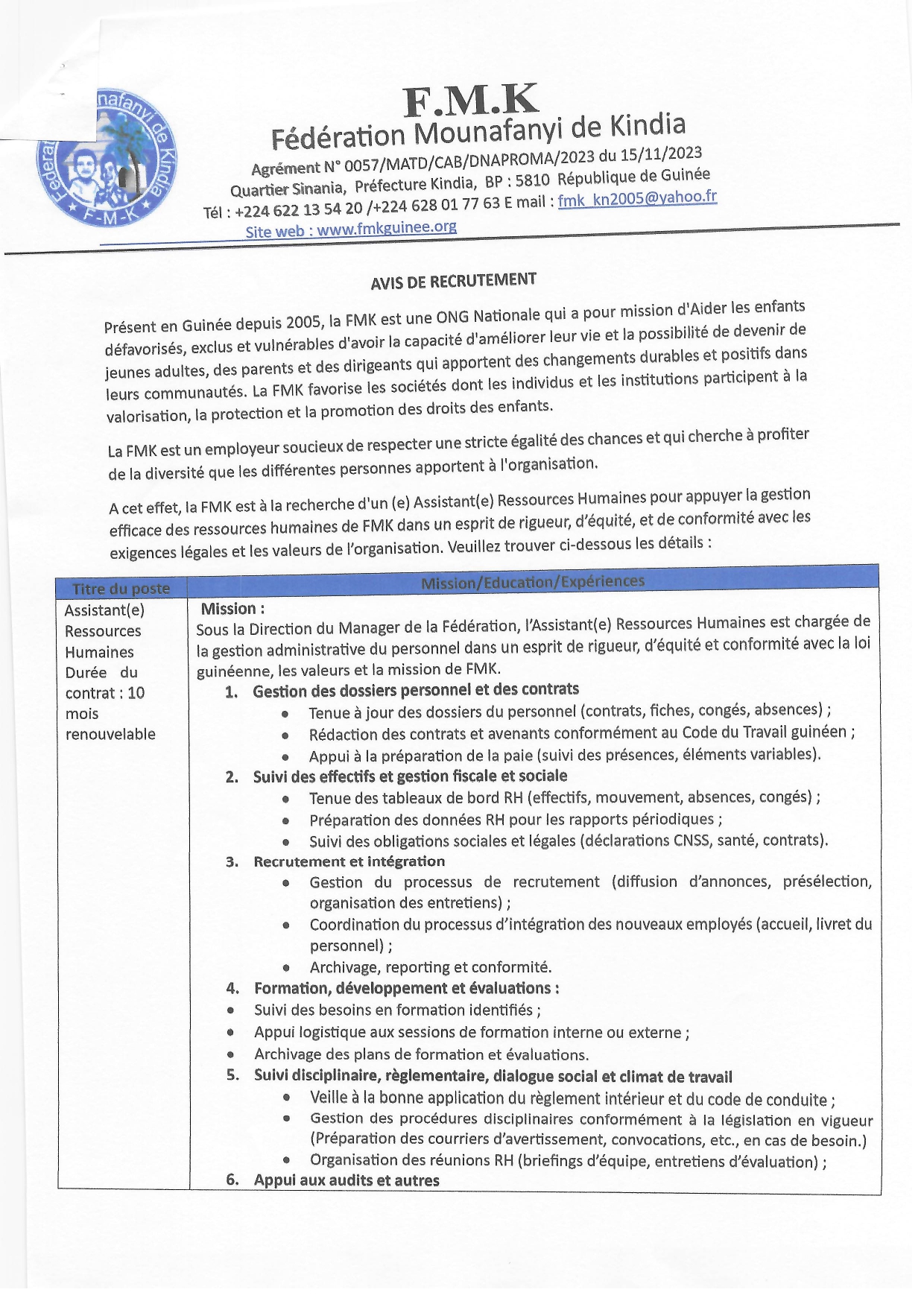 > Avis de recrutement d'un (e) Assistant(e) Ressources Humaines