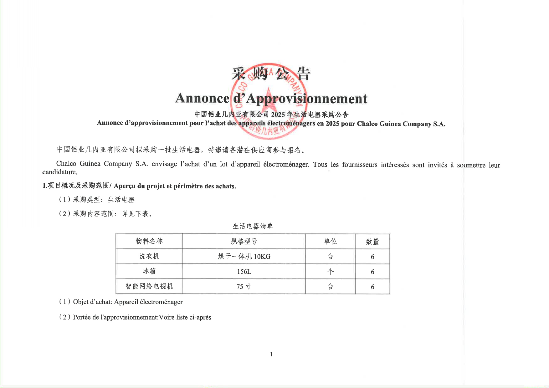 > Annonce d'approvisionnement pour l'achat des appareils électroménagers en 2025 pour Chalco Guinea Company S.A.