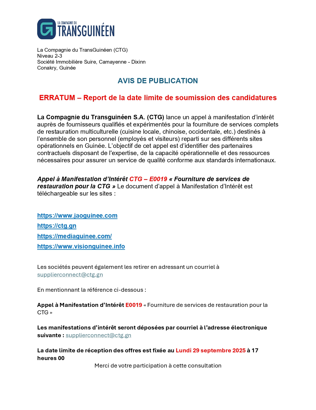 > ERRATUM – Report de la date limite de soumission des candidatures: Fourniture de services de restauration pour la CTG