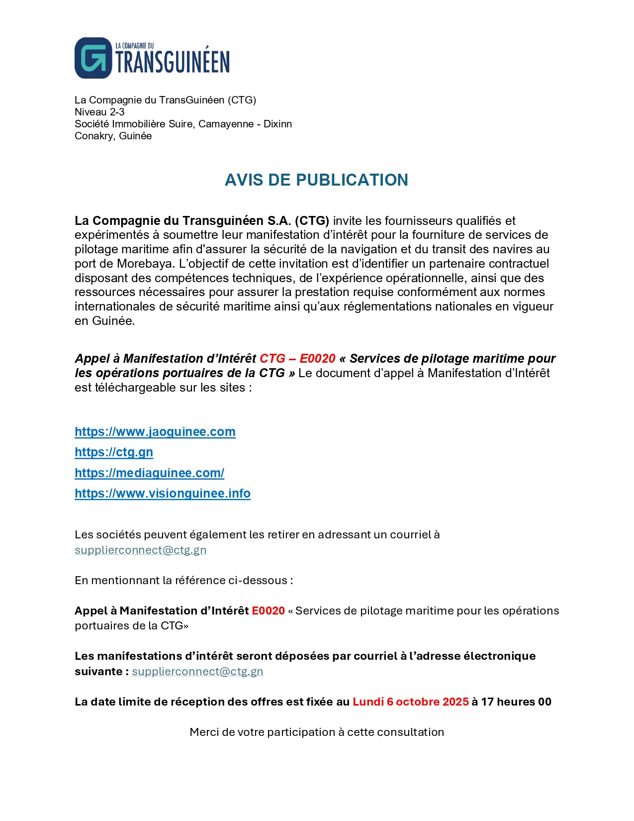 > Appel à manifestation d'intérêt (AMI) pour des Services de pilotage maritime pour les opérations portuaires de la CTG E0020