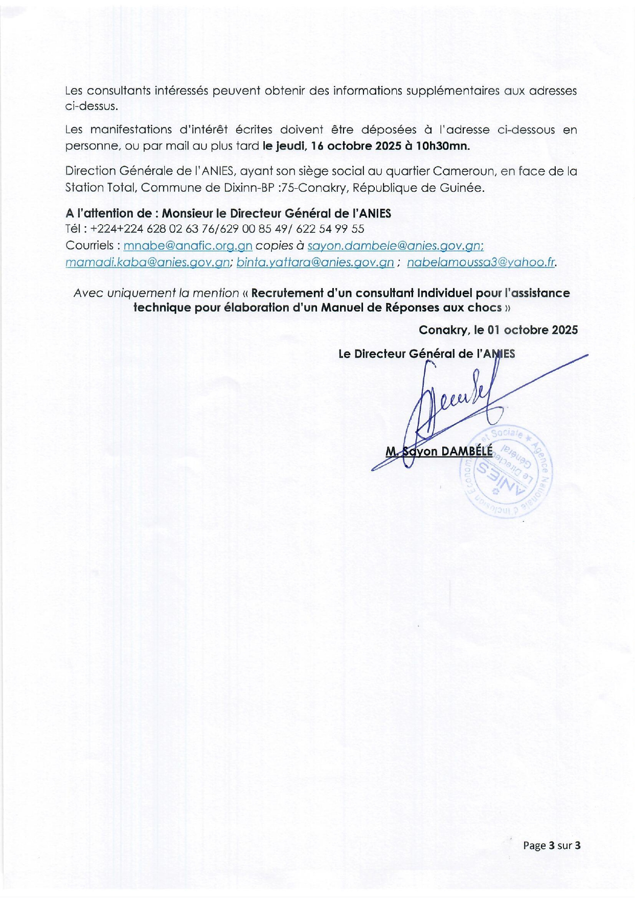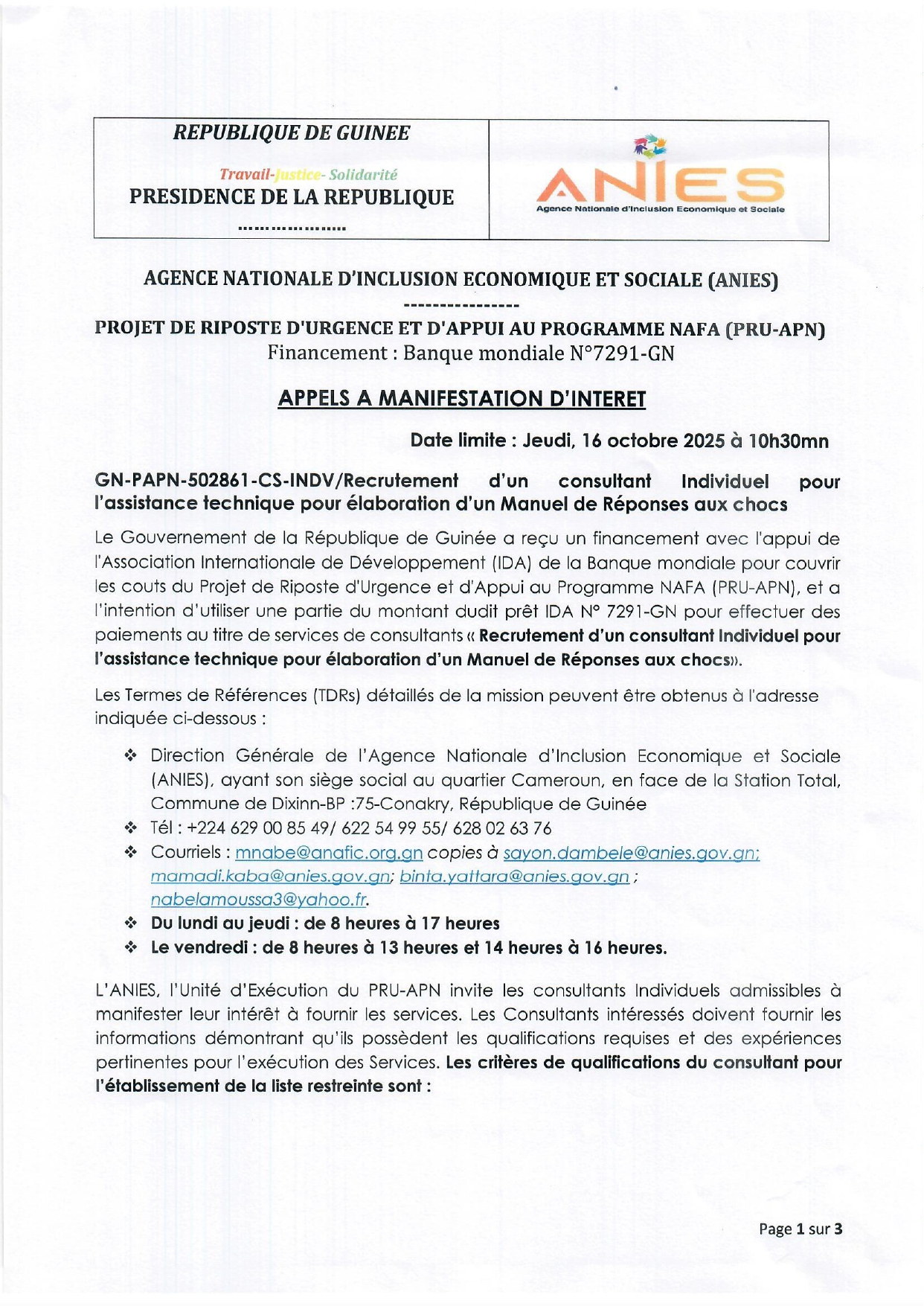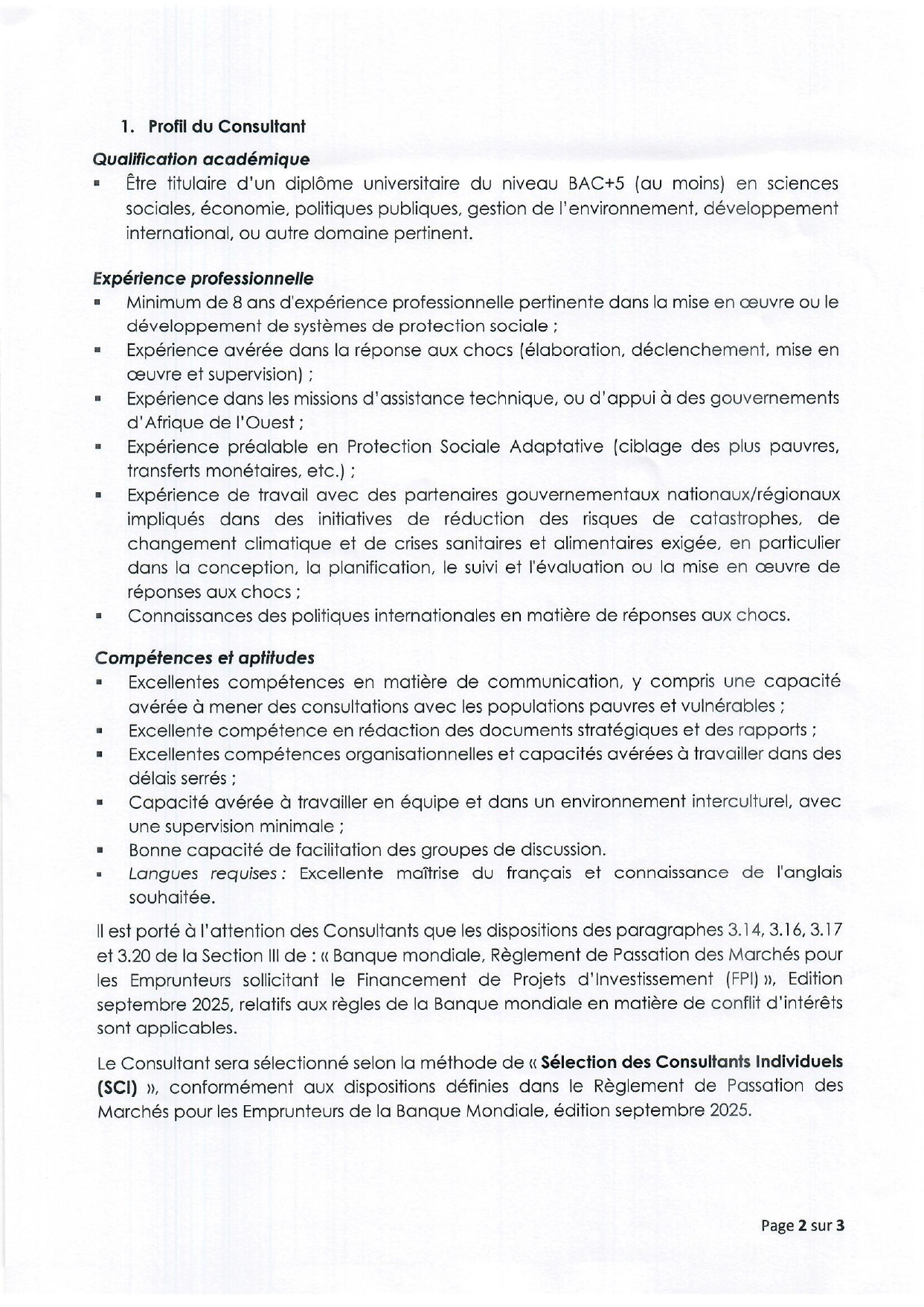> Avis à manifestation d'intérêt pour le Recrutement d’un consultant Individuel pour l’assistance technique pour élaboration d’un Manuel de Réponses aux chocs