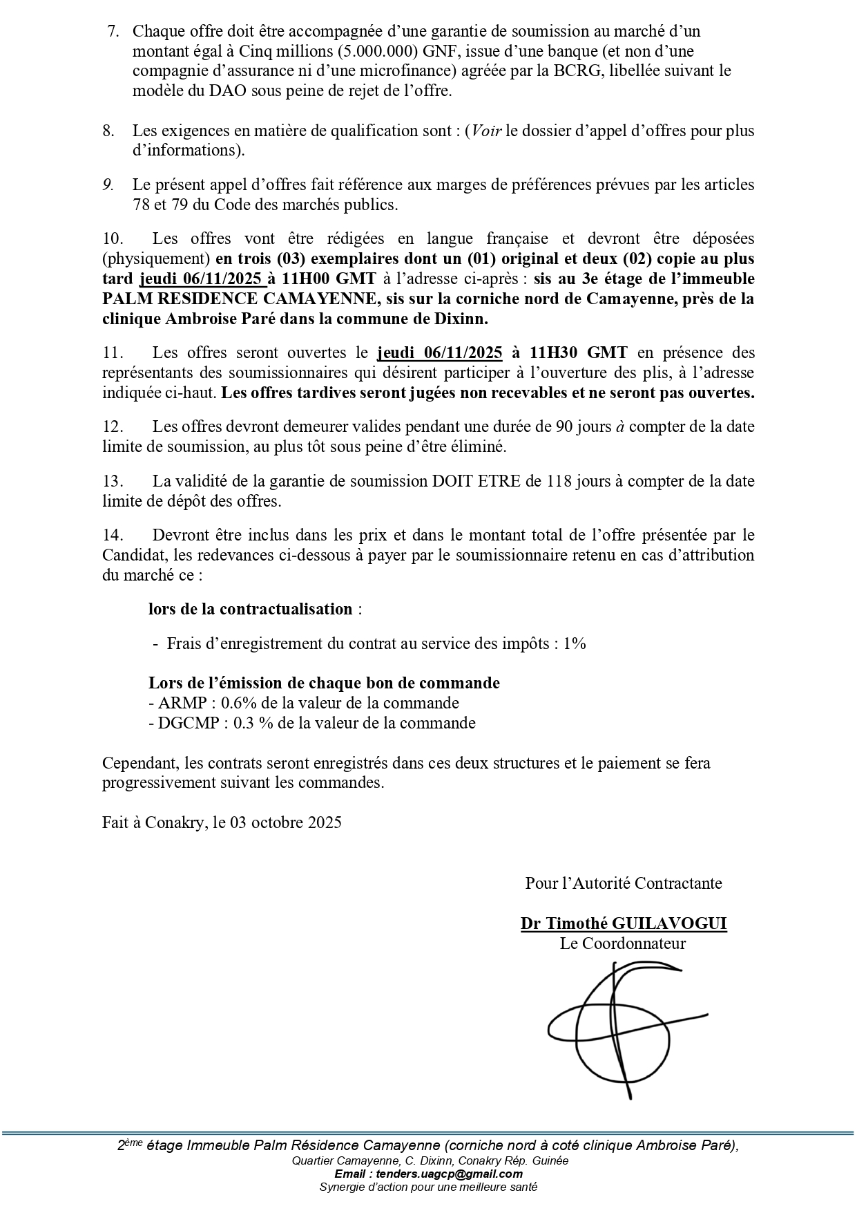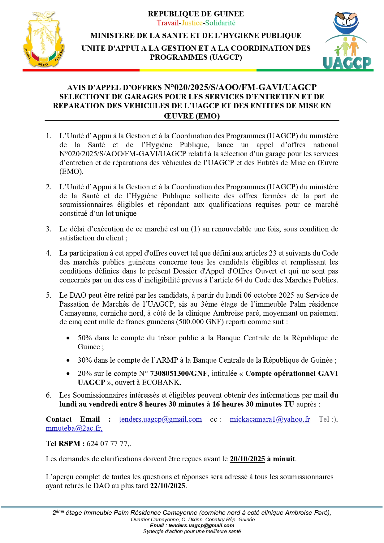> AVIS D’APPEL D’OFFRES POUR LA SELECTION DE GARAGES POUR LES SERVICES D’ENTRETIEN ET DE REPARATION DES VEHICULES DE L’UAGCP ET DES ENTITES DE MISE EN ŒUVRE (EMO)