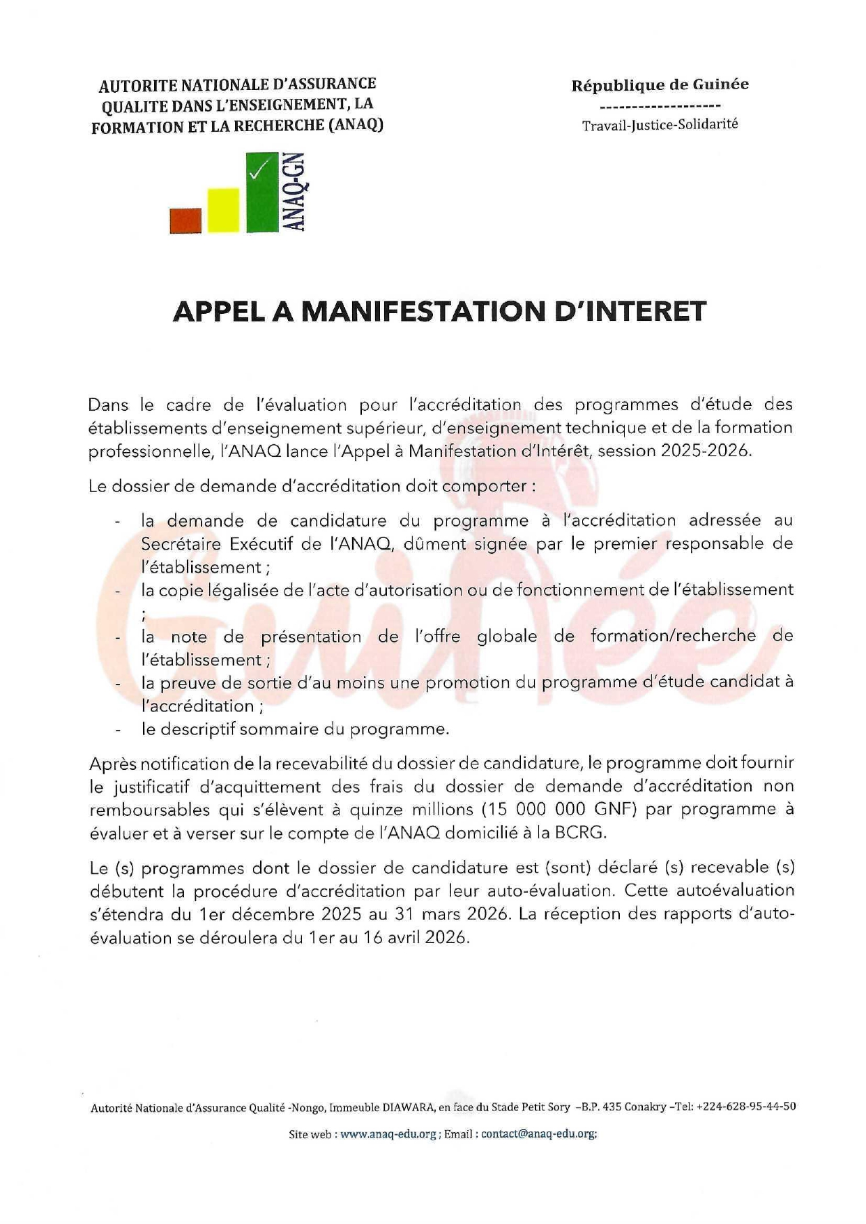 > APPEL A MANIFESTATION D'INTERET : l'évaluation pour l'accréditation des programmes d'étude des établissements d'enseignement supérieur, d'enseignement technique et de la formation professionnelle