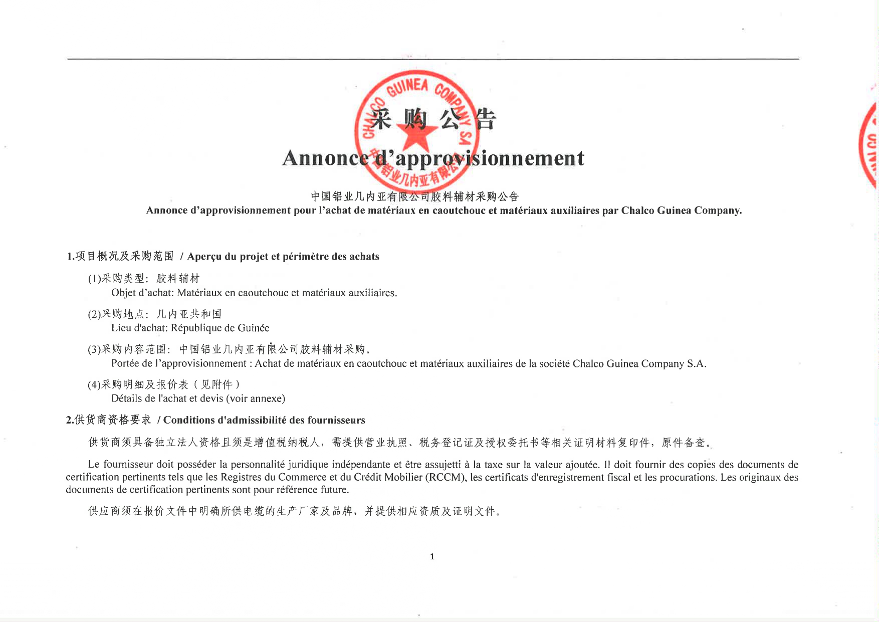> Annonce d'approvisionnement pour l'achat de matériaux en caoutchouc et matériaux auxiliaires par Chalco Guinea Company