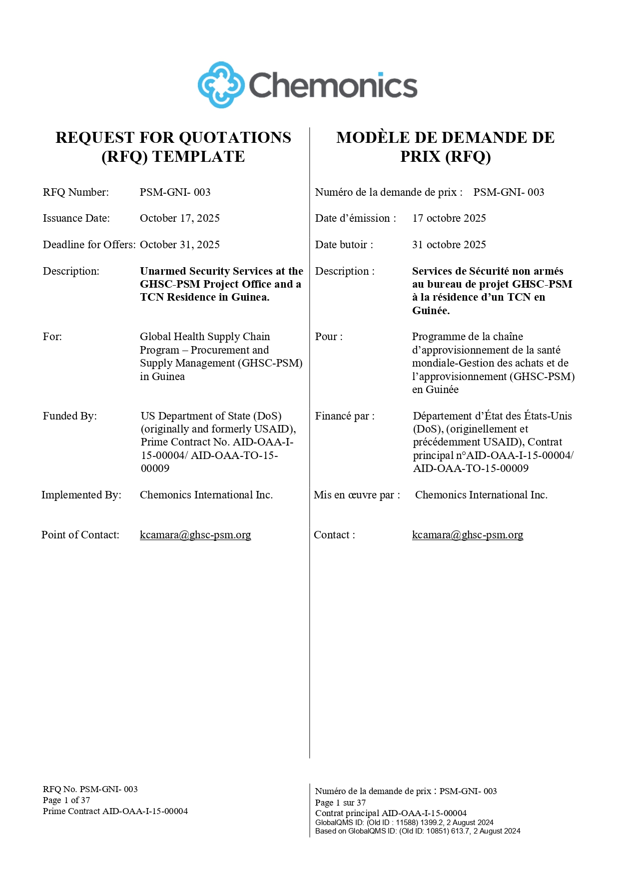 > Demande prix: Services de Sécurité non armés au bureau de projet GHSC-PSM à la résidence d’un TCN en Guinée