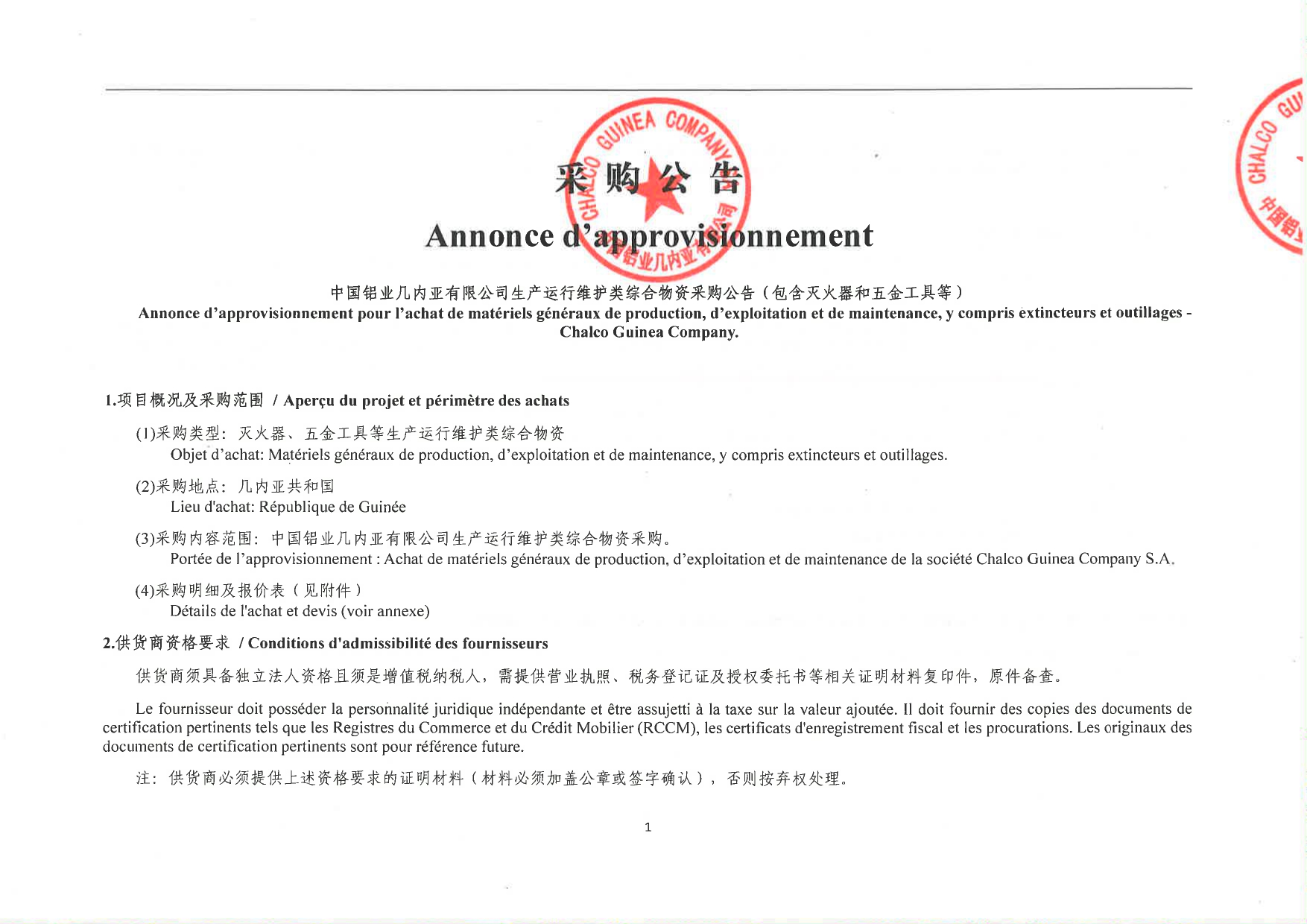 > Annonce d'approvisionnement pour l'achat de matériels généraux de production, d'exploitation et de maintenance, y compris extincteurs et outillages -Chalco Guinea Company