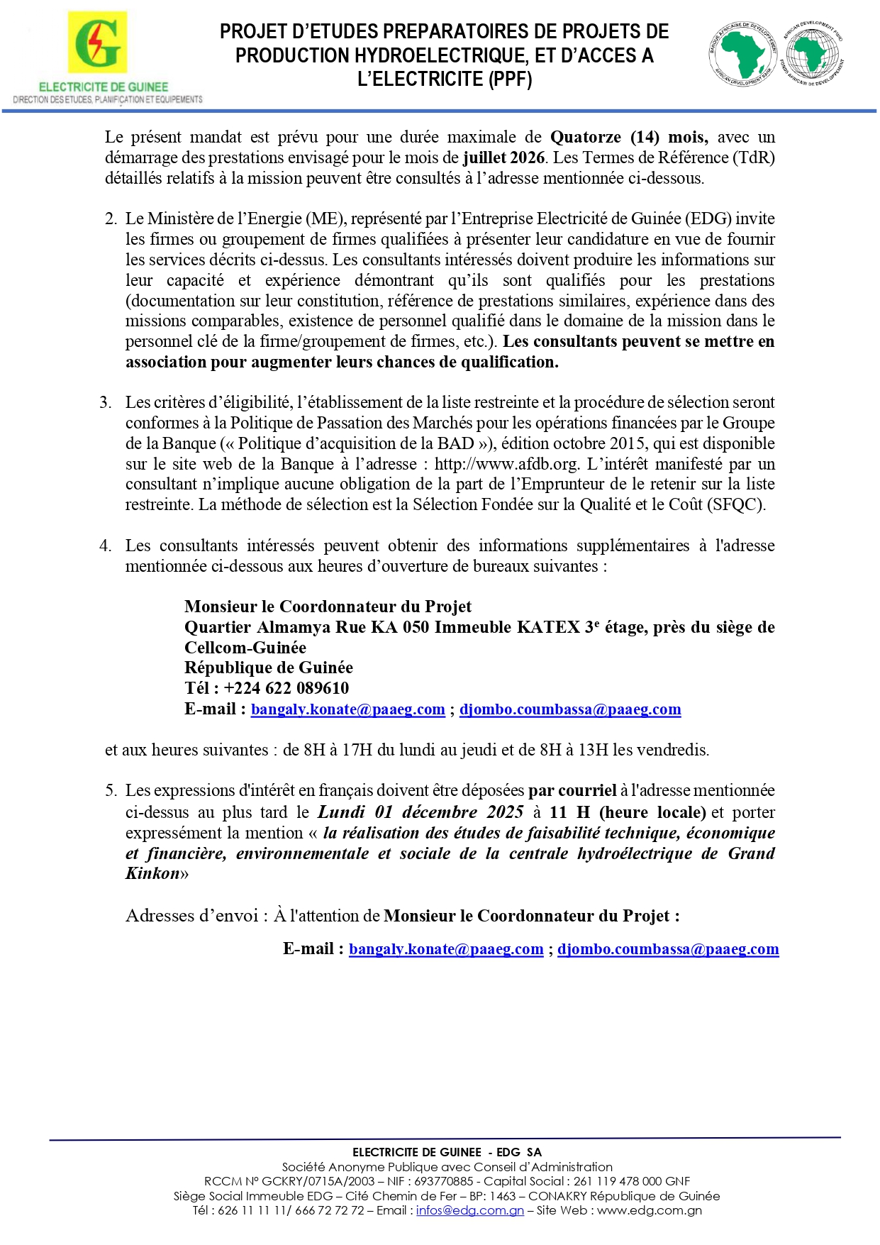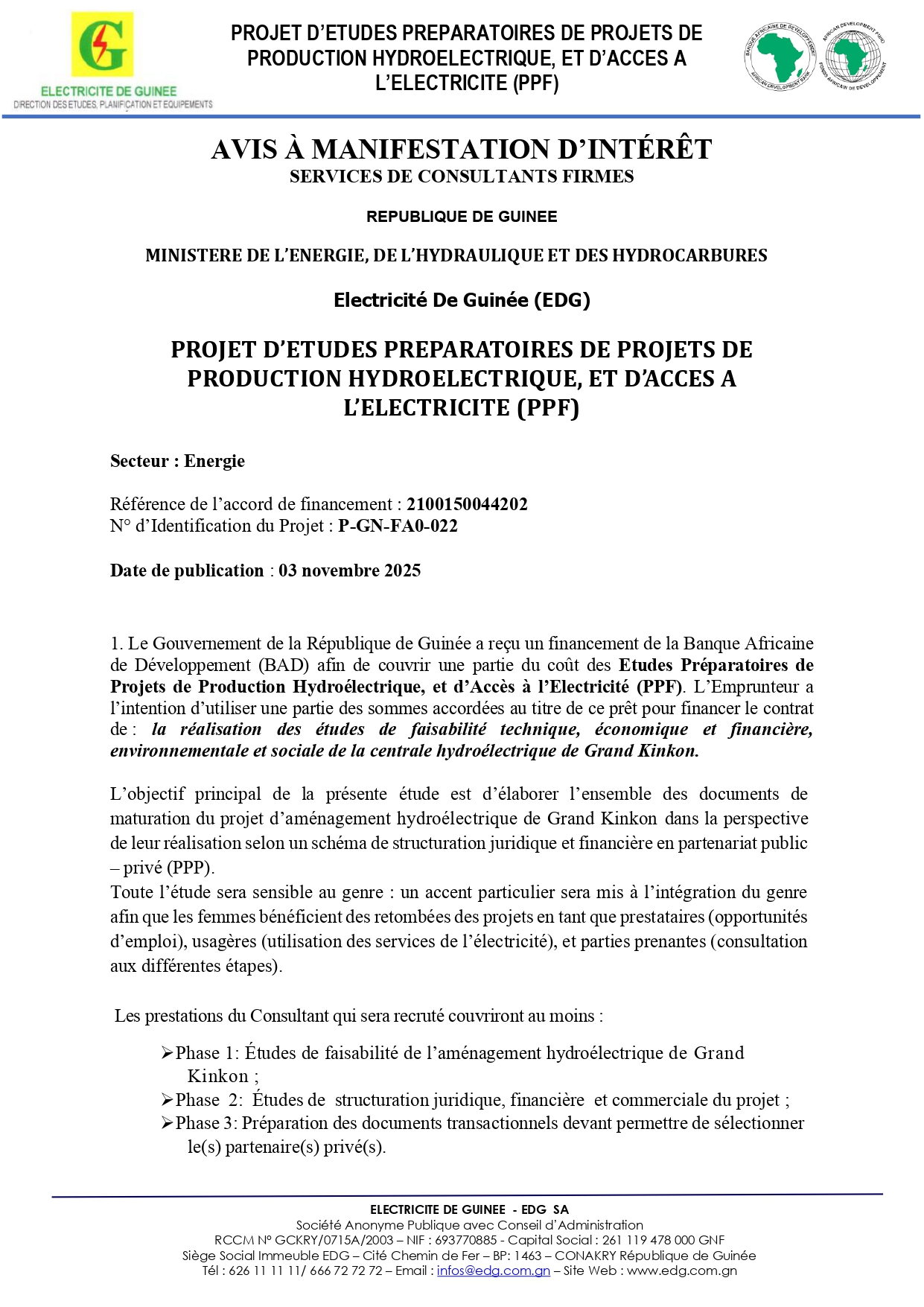 > Avis à manifestation d'intérêt pour la réalisation des études de faisabilité technique, économique et financière, environnementale et sociale de la centrale hydroélectrique de Grand Kinkon