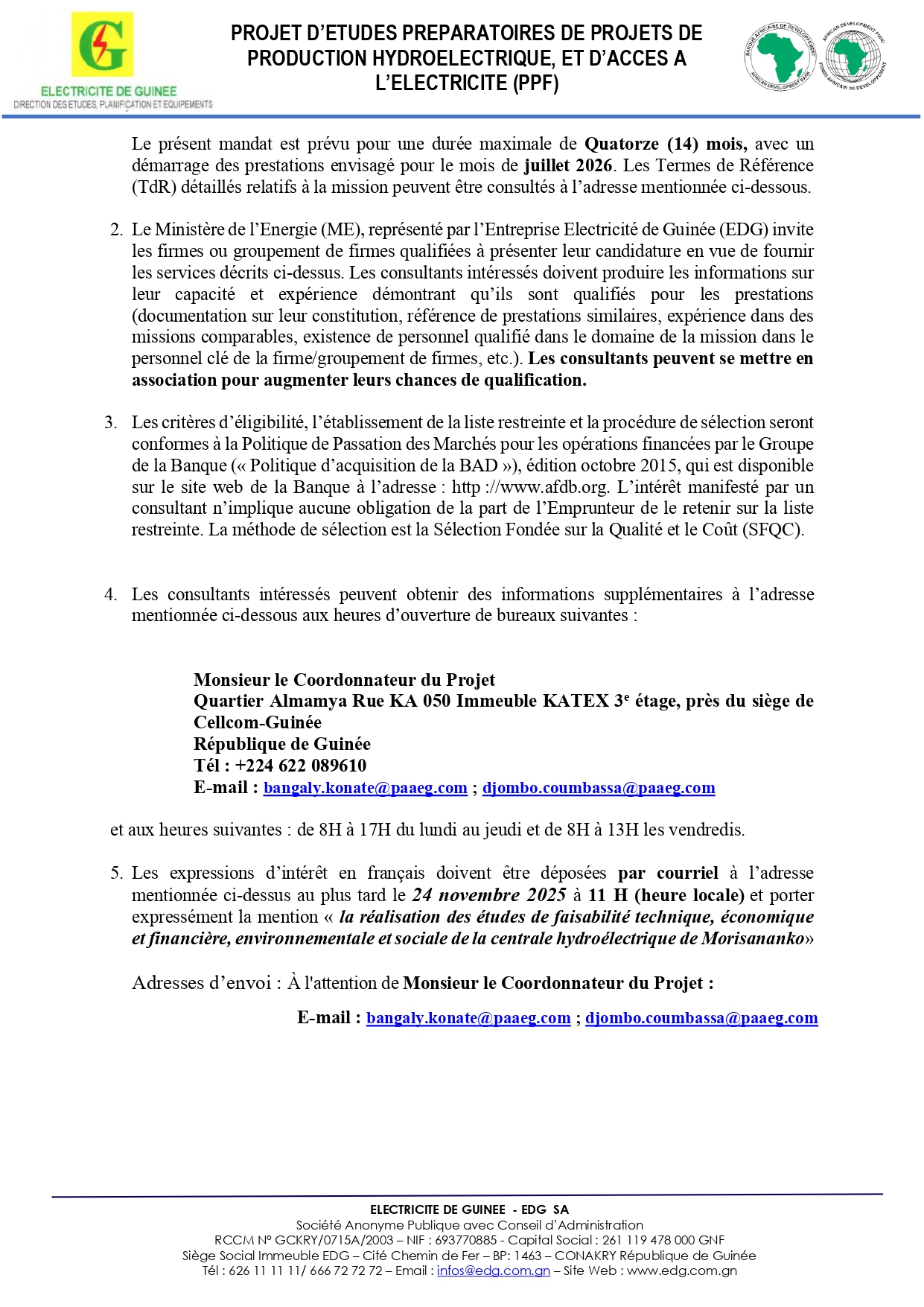 > Avis à manifestation d'intérêt pour la réalisation des études de faisabilité technique, économique et financière, environnementale et sociale de la centrale hydroélectrique de Morisananko